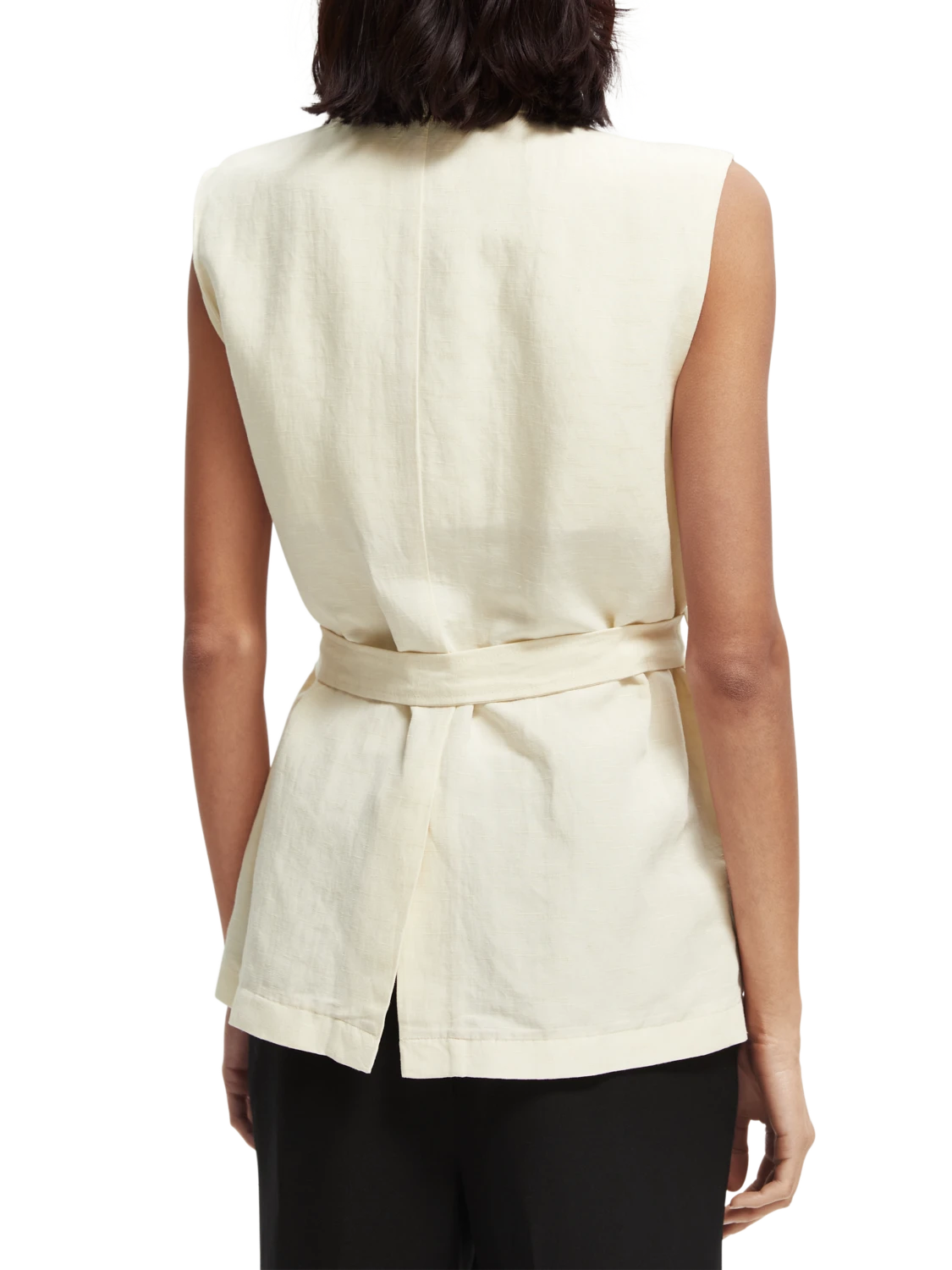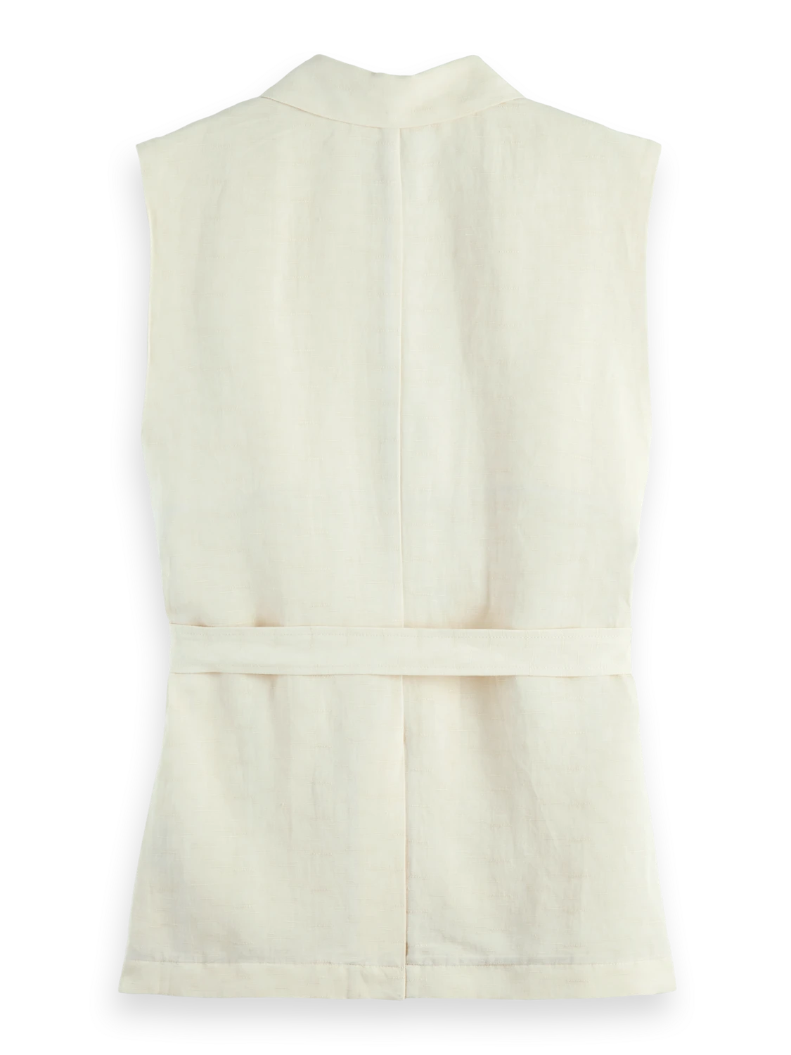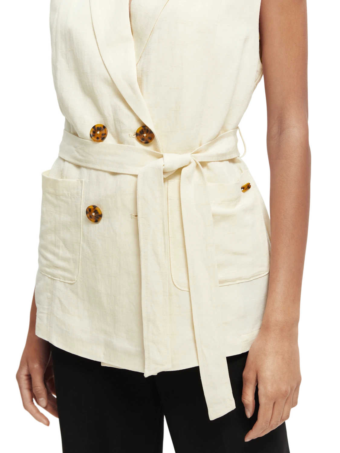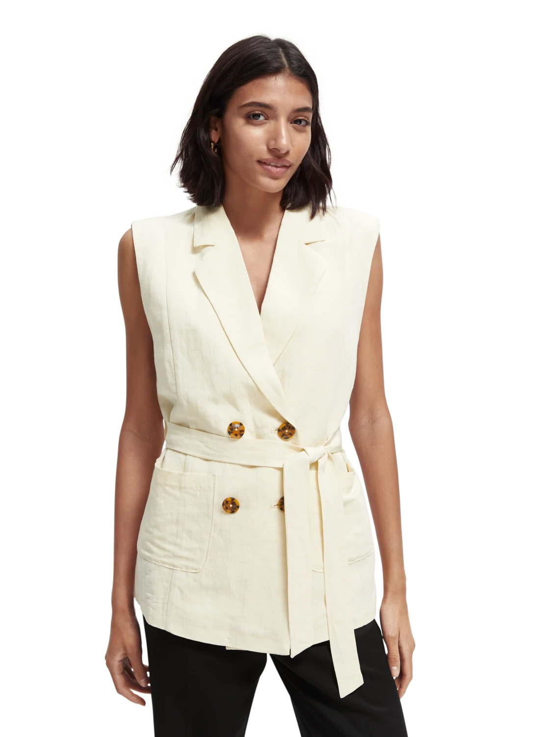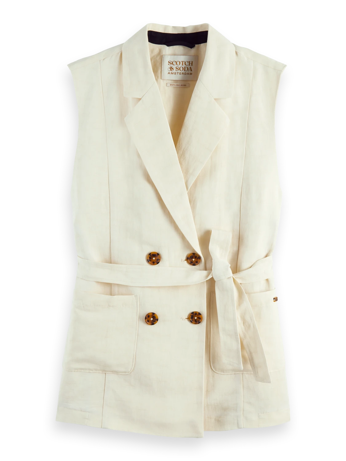 This gilet adds a contemporary yet versatile choice to any collection. With its classic double-breasted design and matching belt, pair this gilet with most jeans or chinos from our collection to quickly uplift your day-to-day style. Made from a lightweight linen (50%) blended material for every-day comfort – fabric composition on care label and listed under highlights & care.