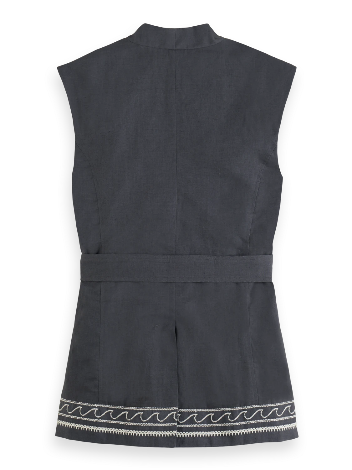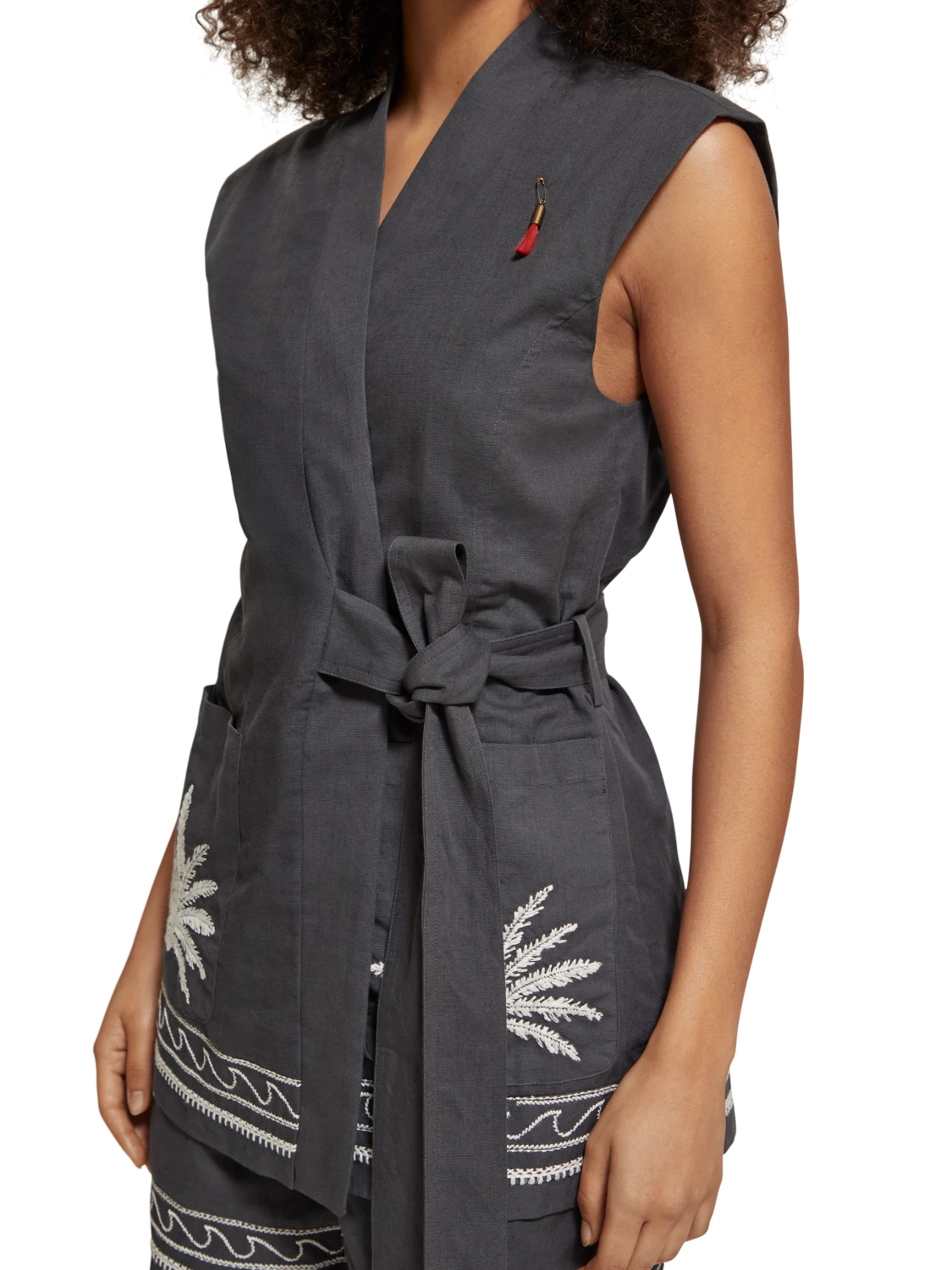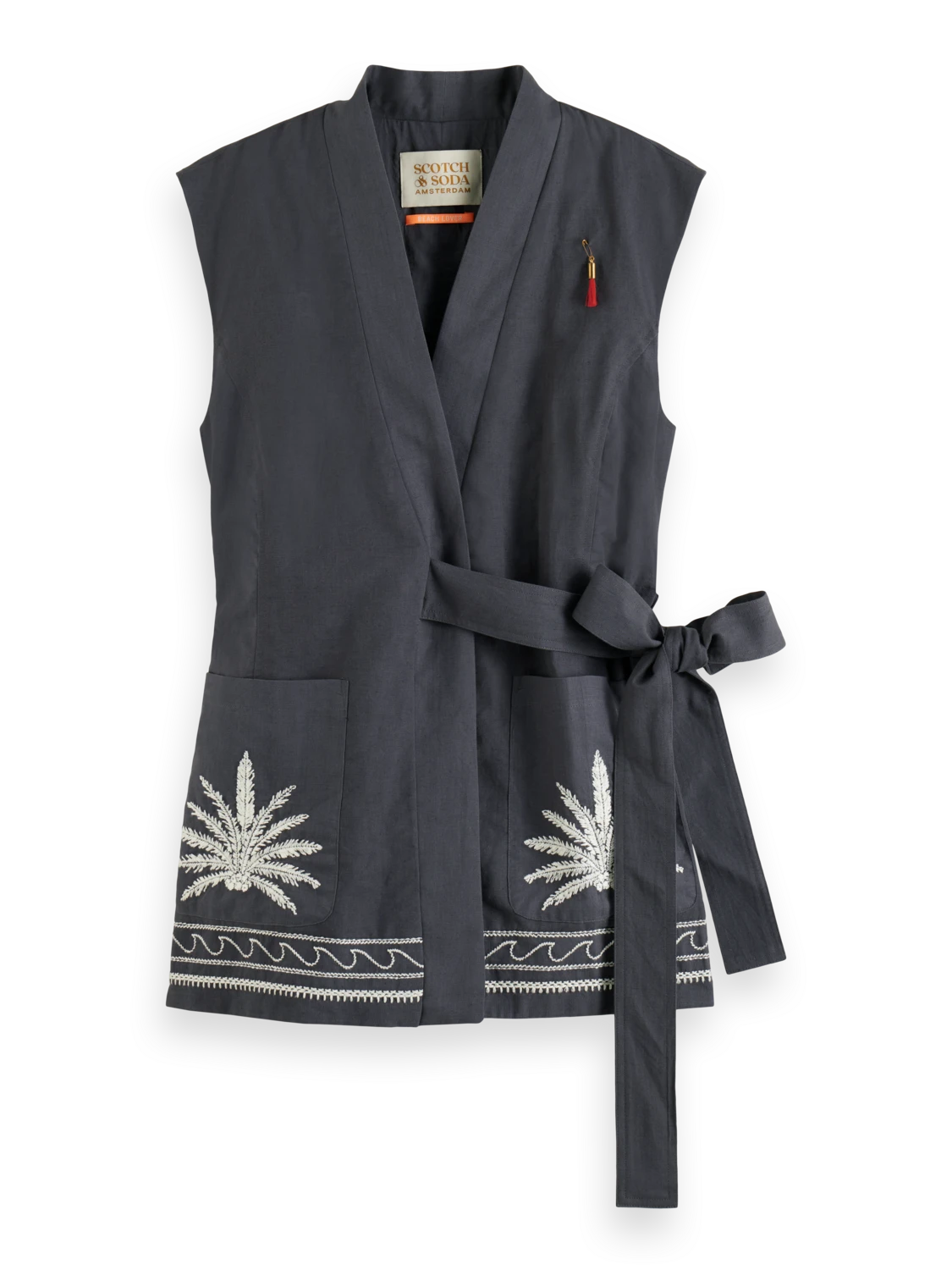 Elevate your style in our Belted Gilet with Palm Embroidery. The palm embroidery adds a touch of tropical flair to this versatile piece. Whether you wear it as a standalone statement or layer it over your favorite outfit, this gilet is sure to turn heads. Crafted with attention to detail and made from high-quality materials, it stands as a testament to your individuality and commitment to original design. Embrace the power of self-expression and let your true style shine through.