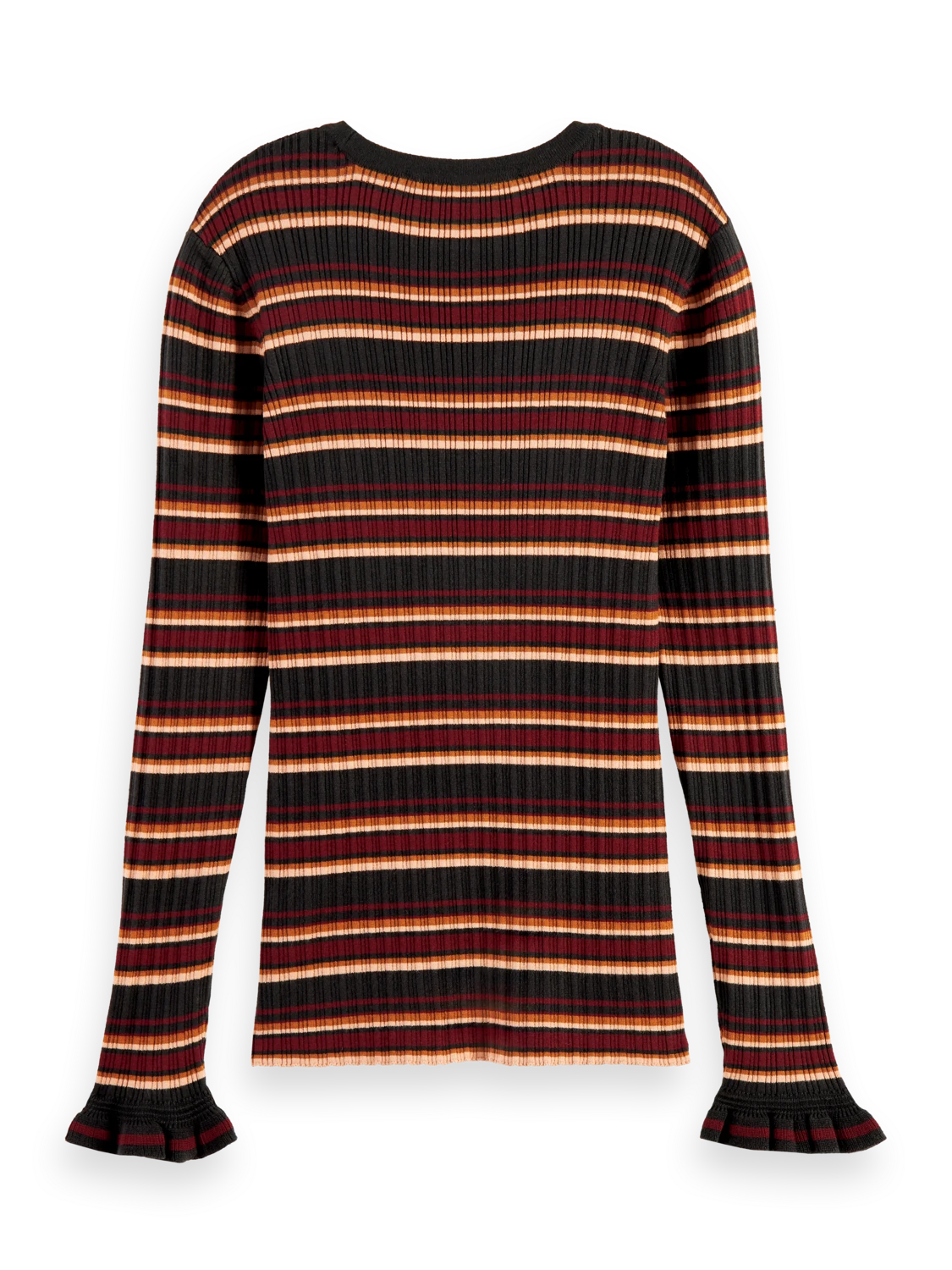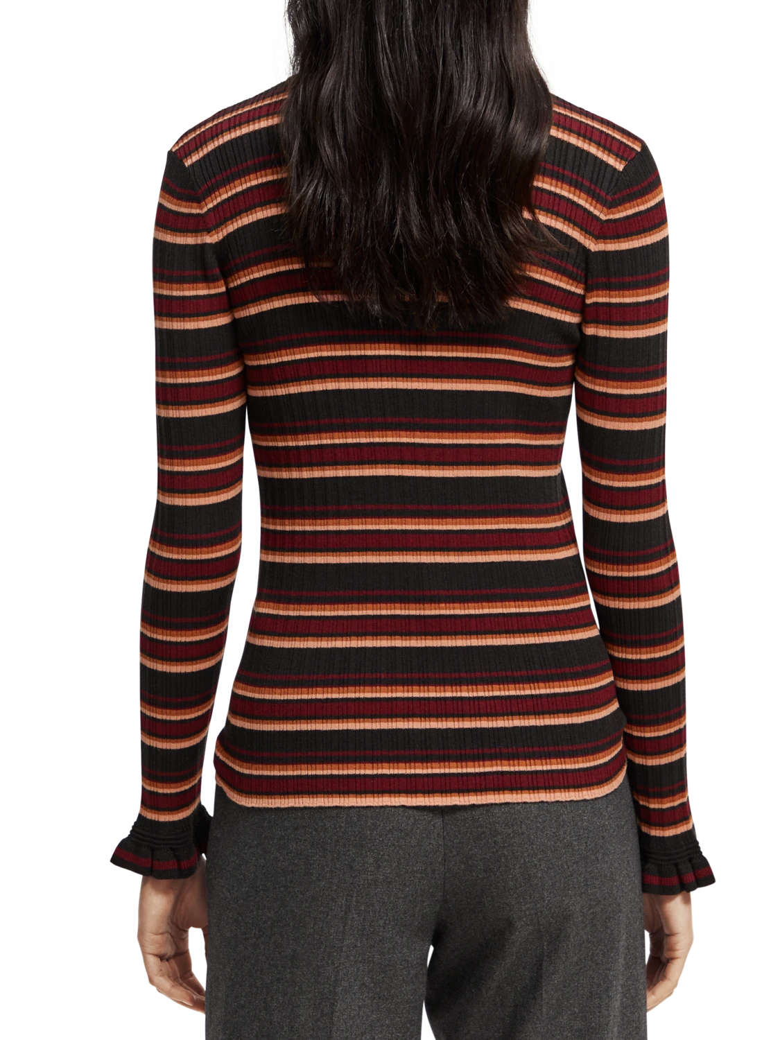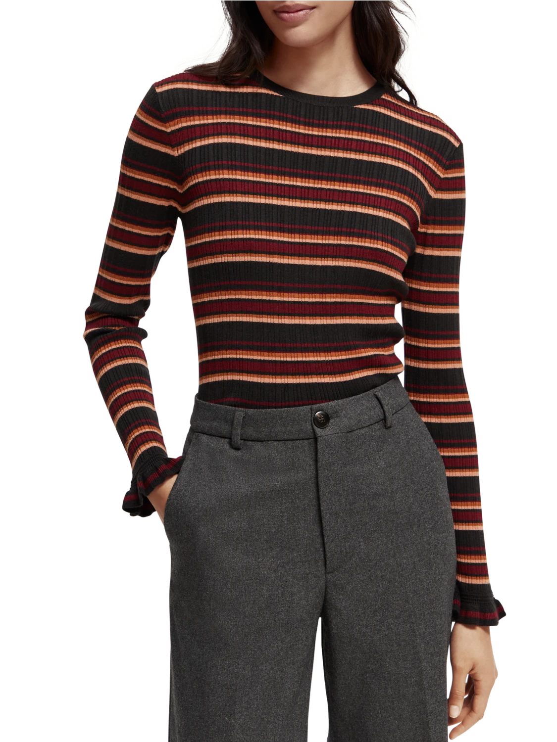 This fitted sweater comes with a rib knit – finished with a rounded collar and ruffling details at the cuff.