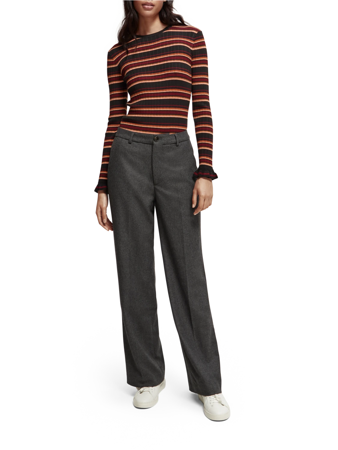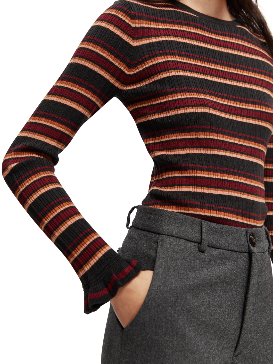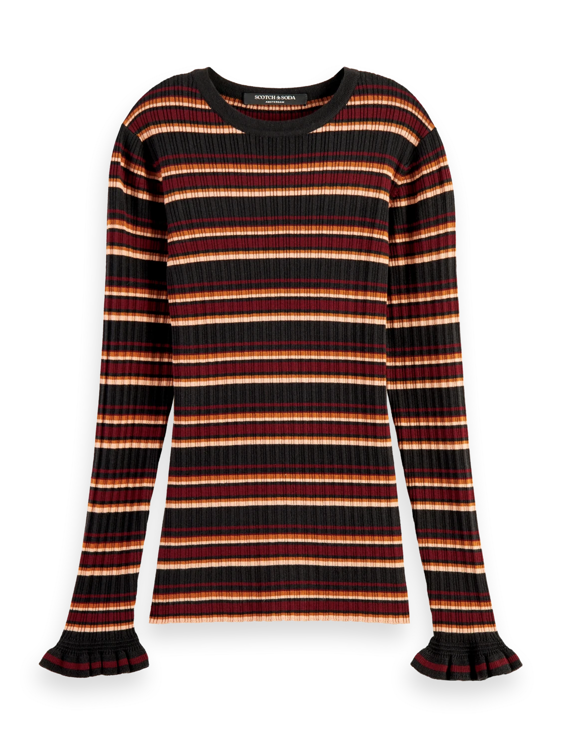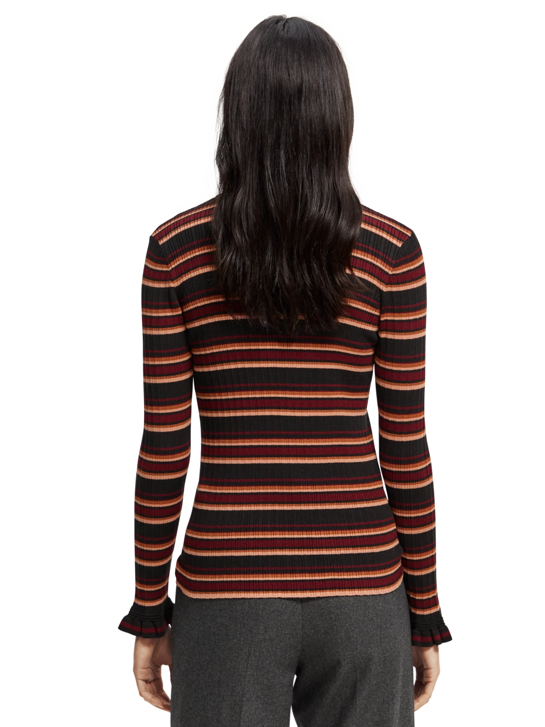 This fitted sweater comes with a rib knit – finished with a rounded collar and ruffling details at the cuff.
