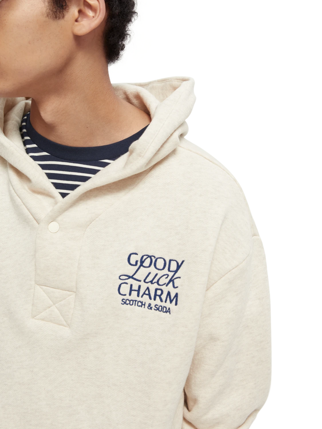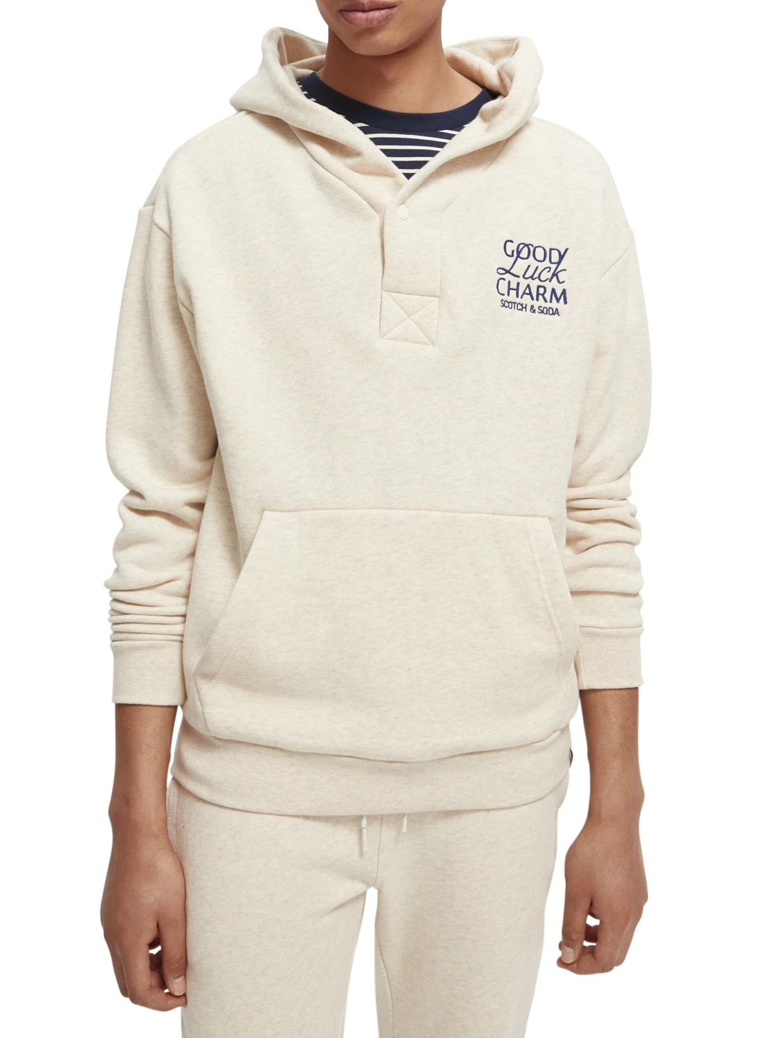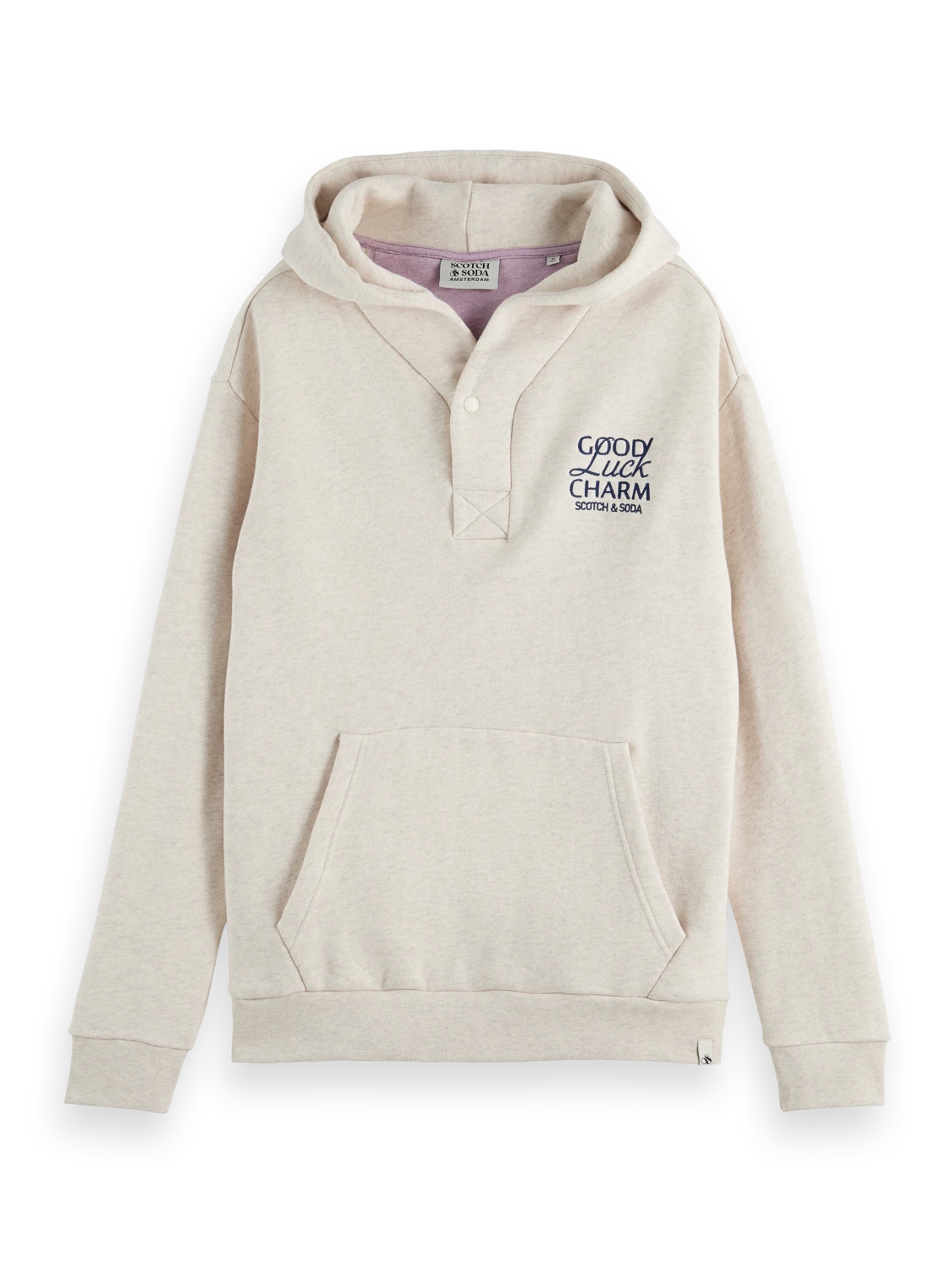This season fear no chill with our melange hoodie with a polo inspired collar and button closure.
