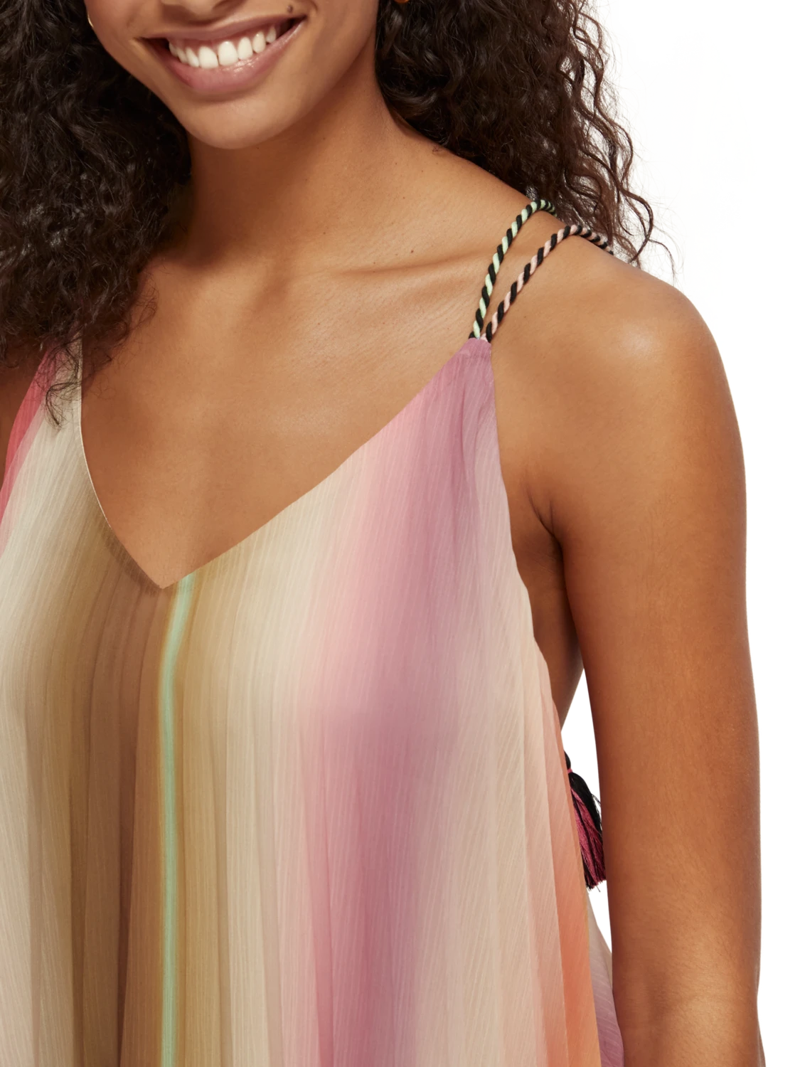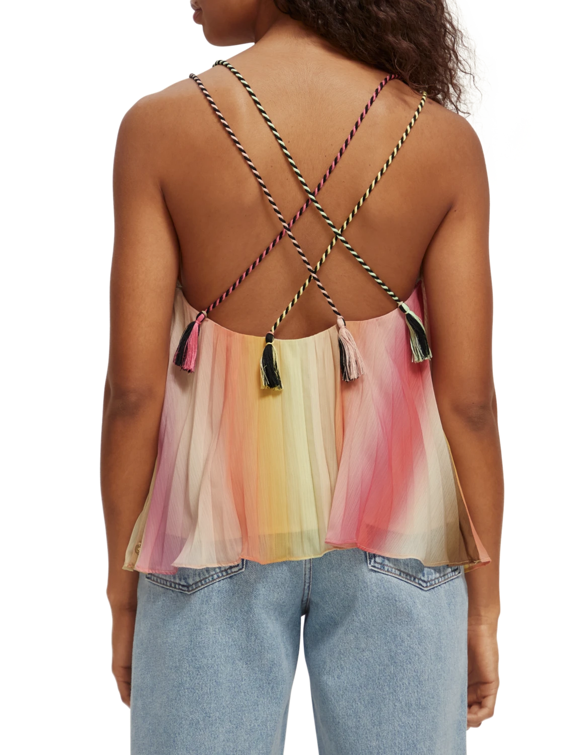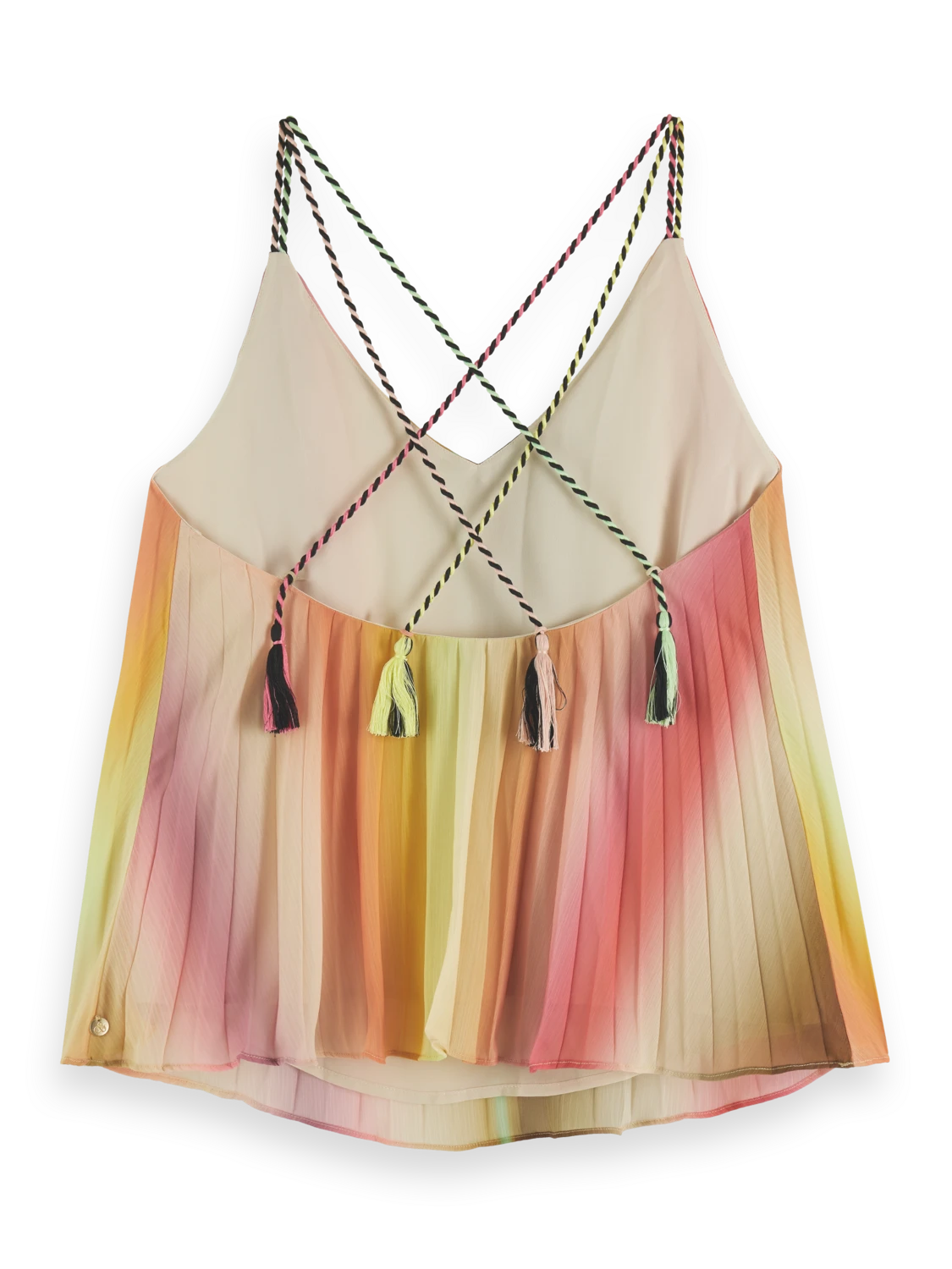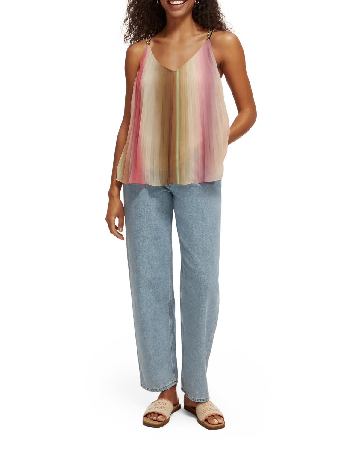 Our latest pleated tank top comes with a V-neck collar and thin, spaghetti-style straps. Featuring an all-over rainbow colouration, this versatile piece is easily worn on its own or layered to add an extra dimension to your favourite looks.