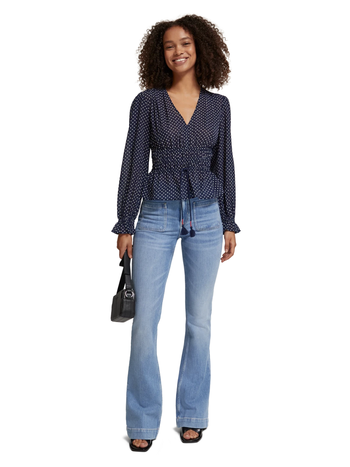 Effortlessly stylish and endlessly versatile, this V-neck top with an elastic waist is a must-have addition to your wardrobe. The V-neckline adds a hint of allure, while the elastic waist creates a flattering silhouette. Pair it with tailored trousers and heels for a polished office look or dress it down with denim shorts and sandals for a laid-back weekend vibe.