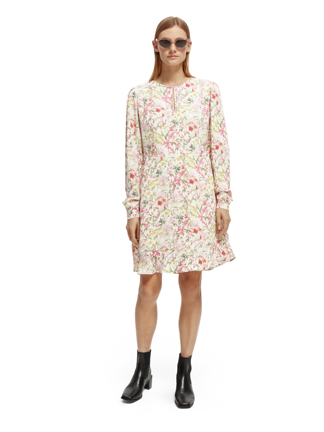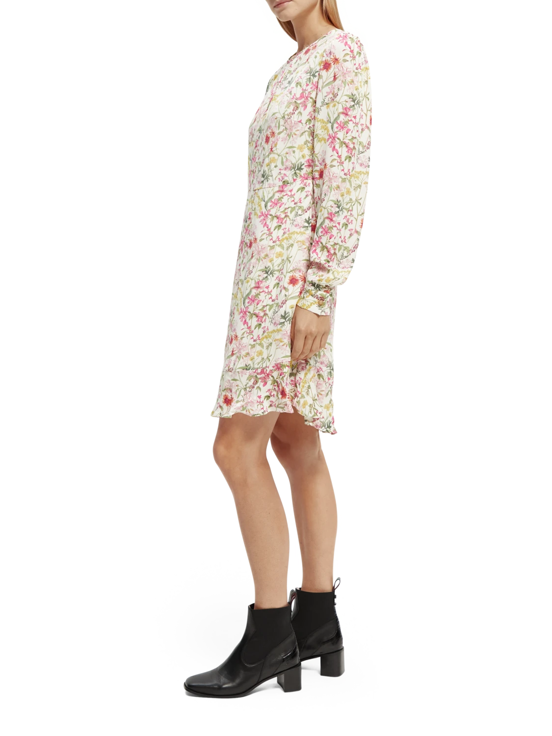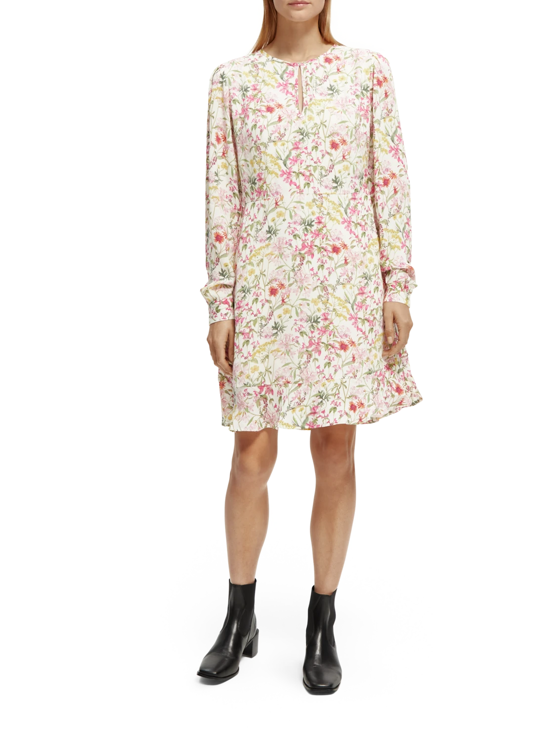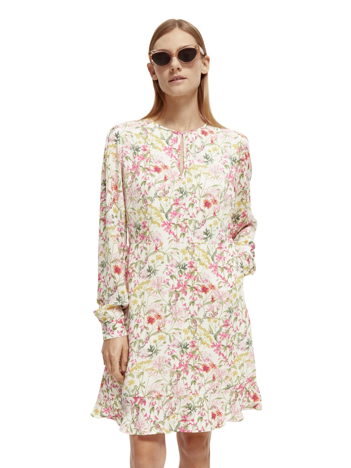 This mini-length dress comes adorned with an eye-catching print. Featuring a buttoned collar which when closed makes for a keyhole neckline – undo the button to transform your look into a V-neck style. Finished with long-sleeves and ruffling detail along the hem.