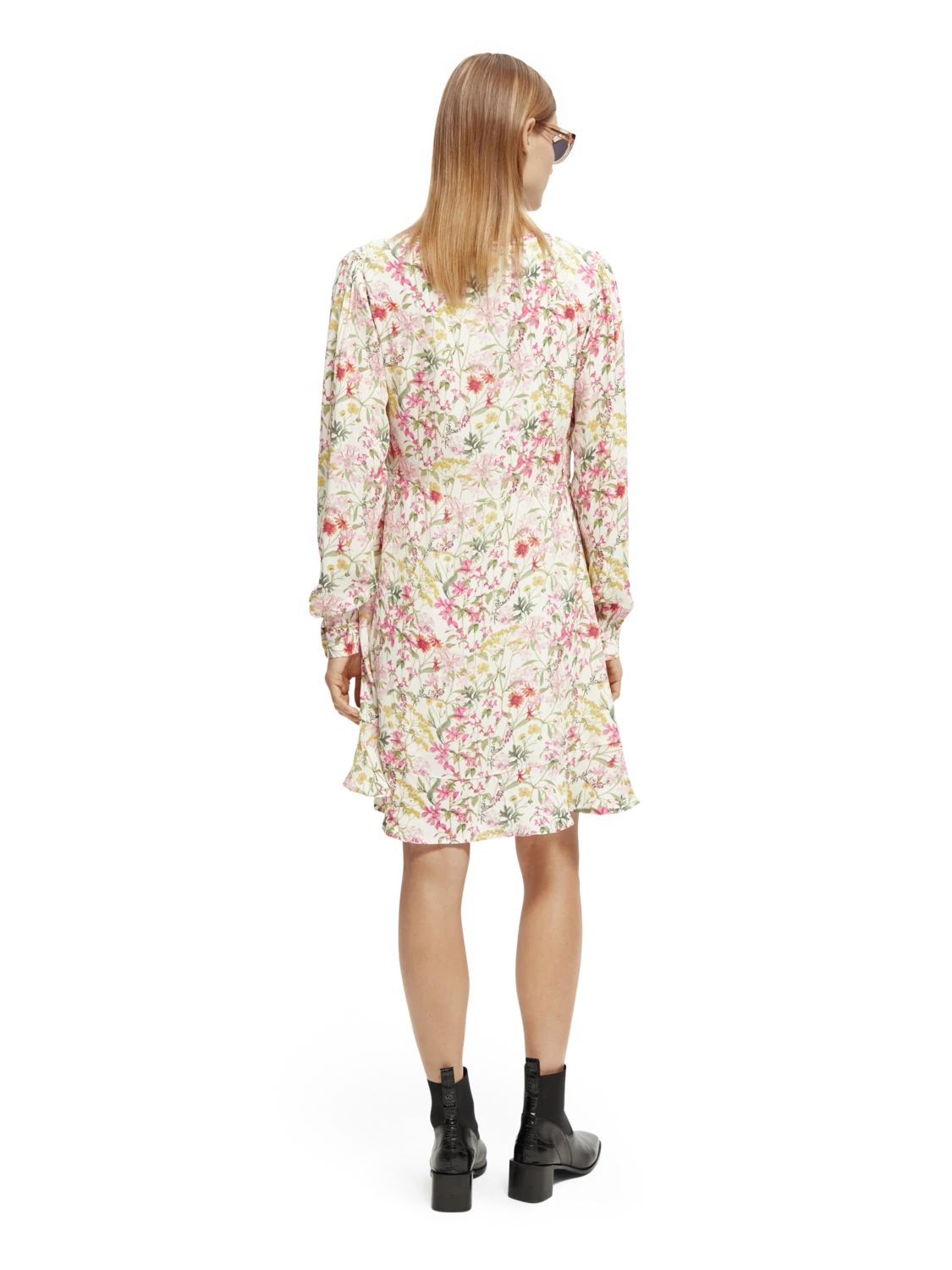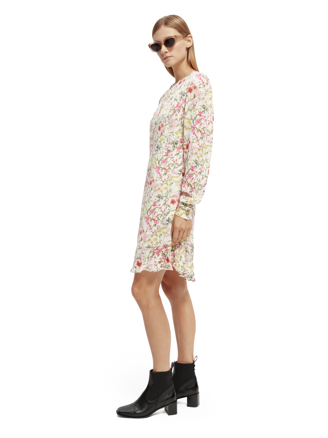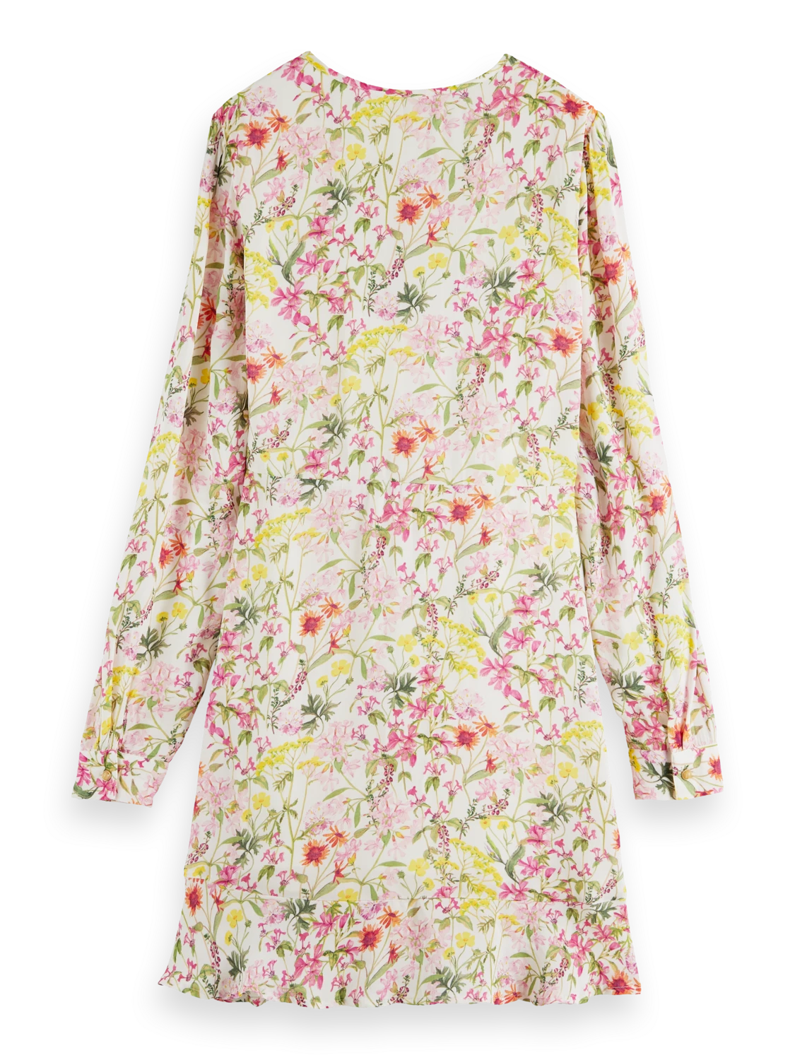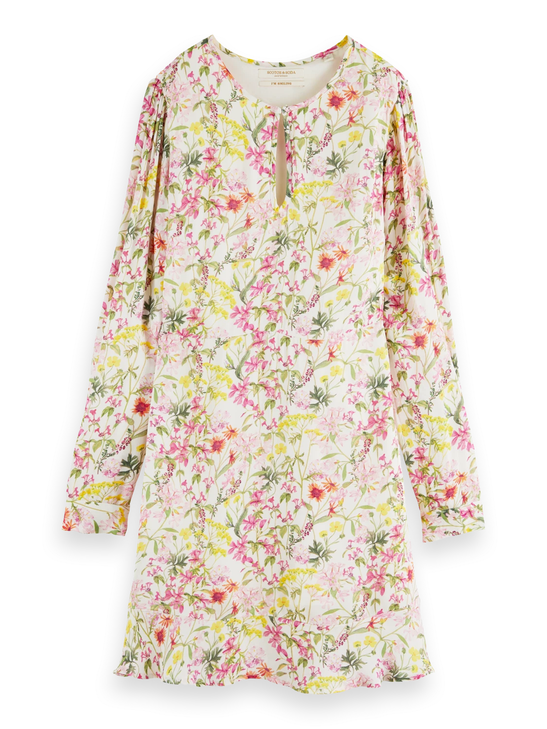 This mini-length dress comes adorned with an eye-catching print. Featuring a buttoned collar which when closed makes for a keyhole neckline – undo the button to transform your look into a V-neck style. Finished with long-sleeves and ruffling detail along the hem.