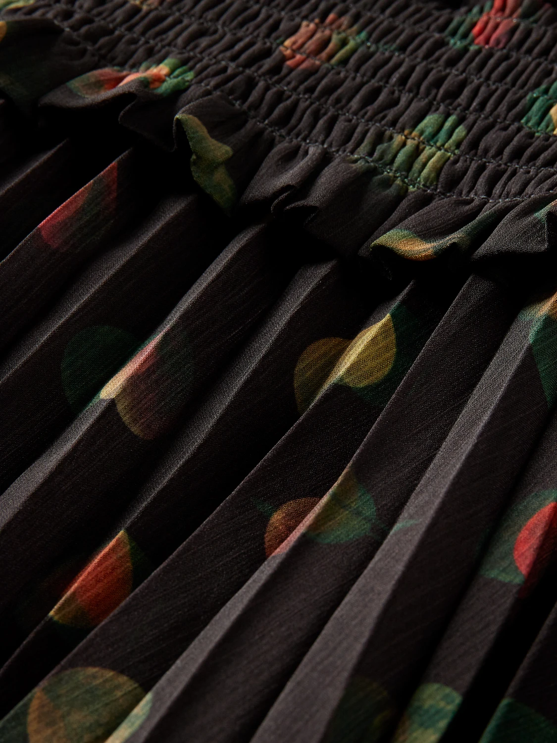 Our latest printed dress comes in a mini length with long sleeves made from a sheer fabric. Featuring a buttoned collar that, when closed gives a keyhole opening – undo the button to transform this dress into a V-neck style. Finished with smocking at the shoulders, waist and cuffs supply a perfect, all-day comfortable fit.