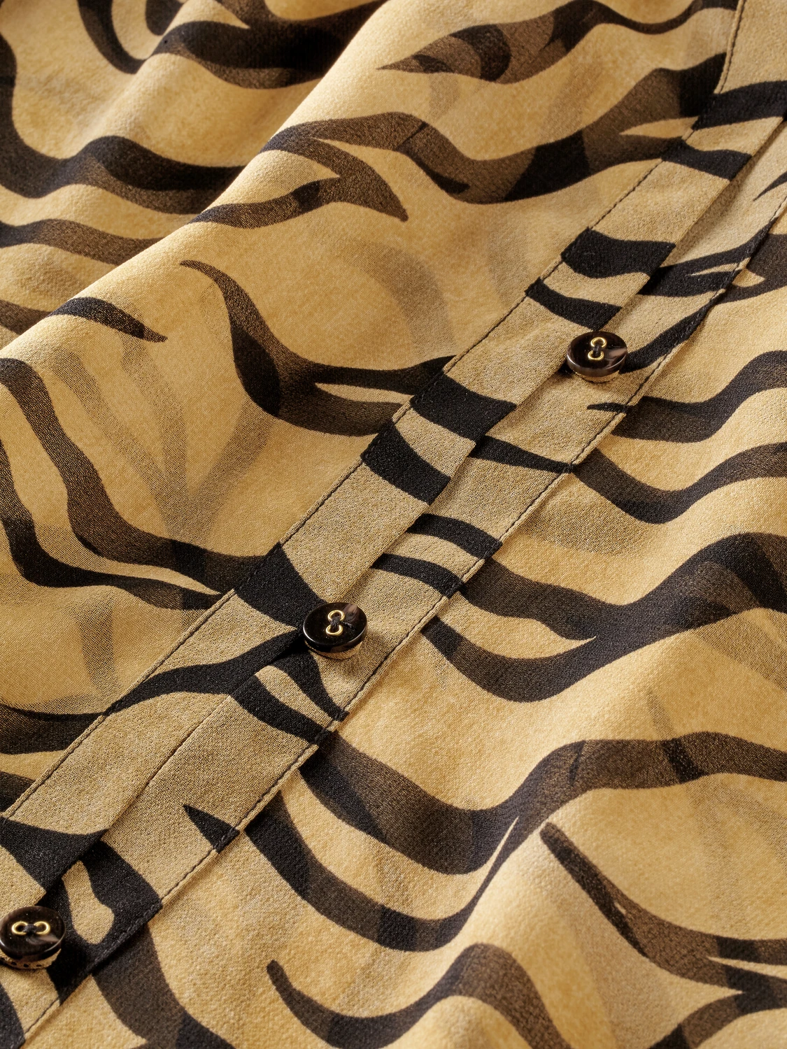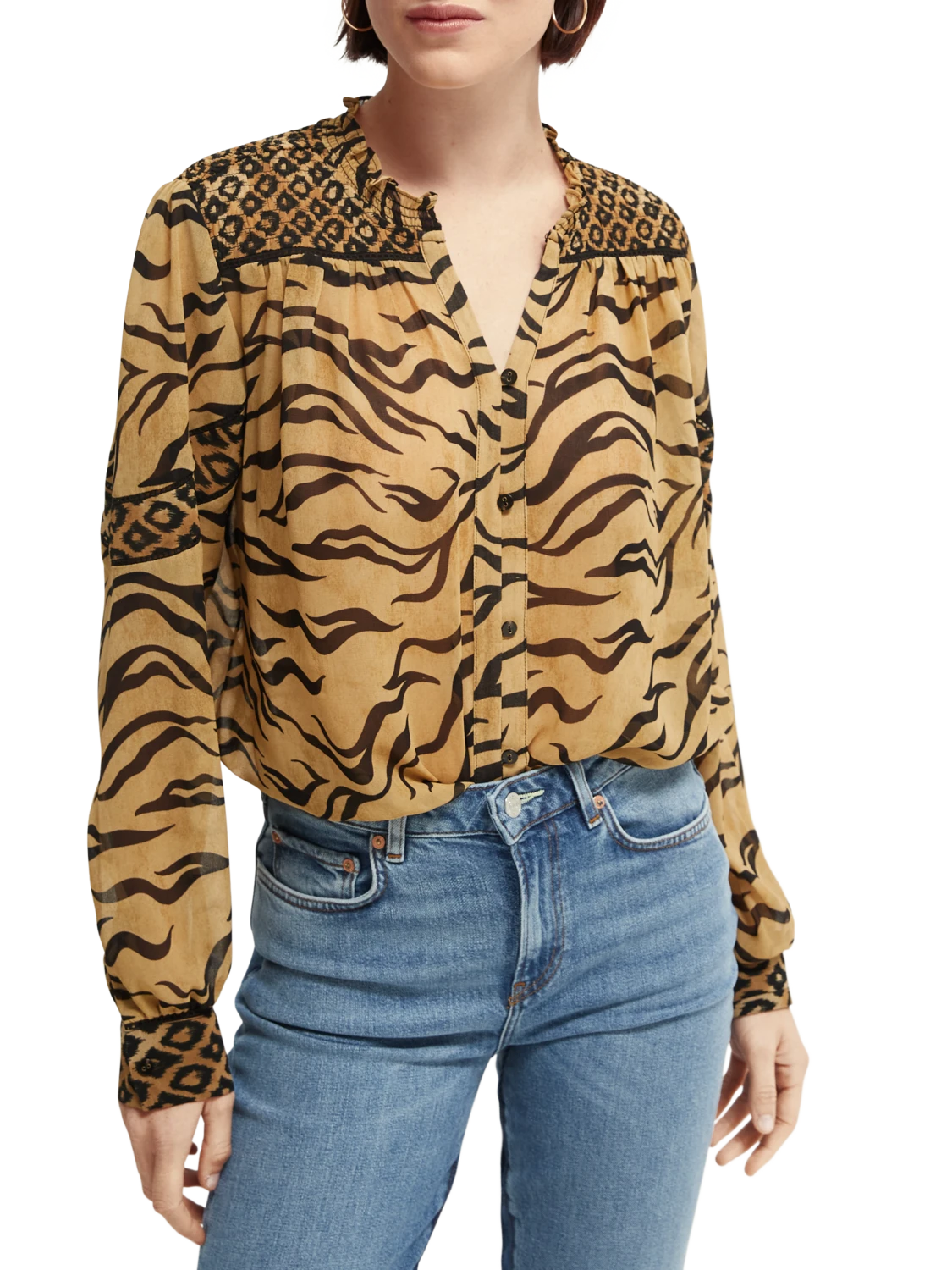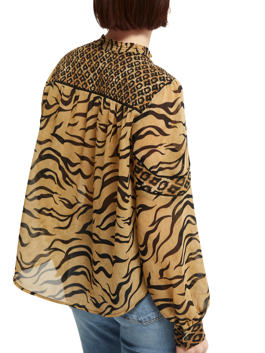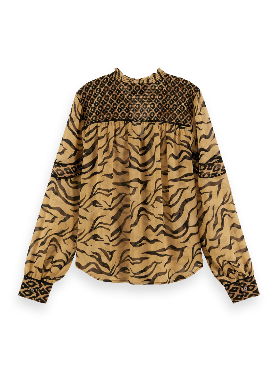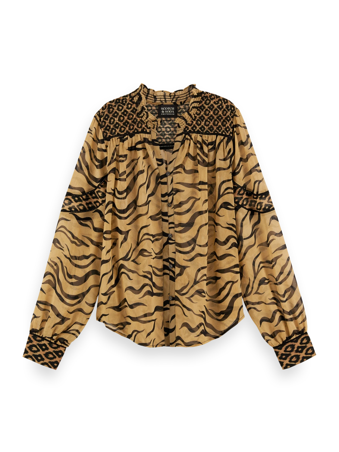 Two stylish prints, smocked and with a badass grandad collar. This sheer shirt will make heads turn, no matter where you’re going.