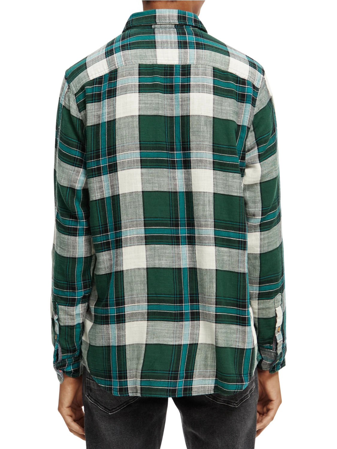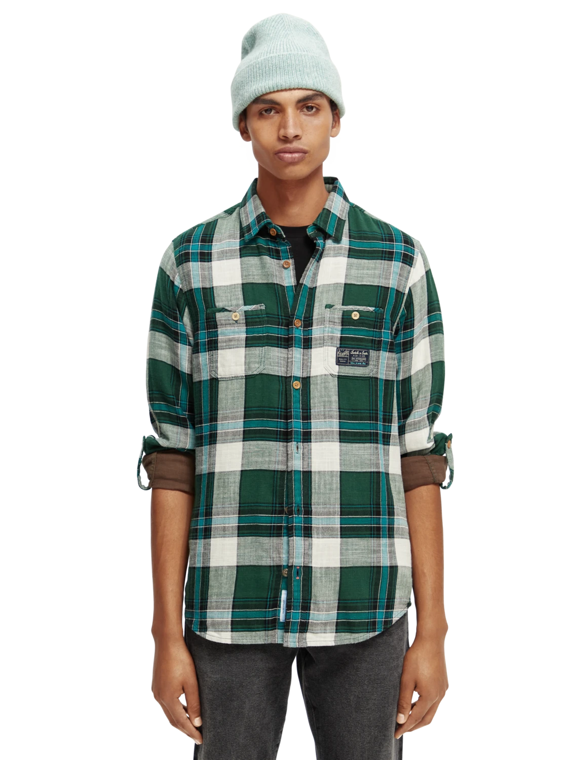 This cotton shirt comes adorned with an all-over checked contrasting plaid design, with two securable chest pockets. Featuring a cleverly hidden sleeve adjustment, simply roll up your sleeves and fasten to transform this style from a long-sleeve to elbow-length. Perfect for wearing on its own or layering.