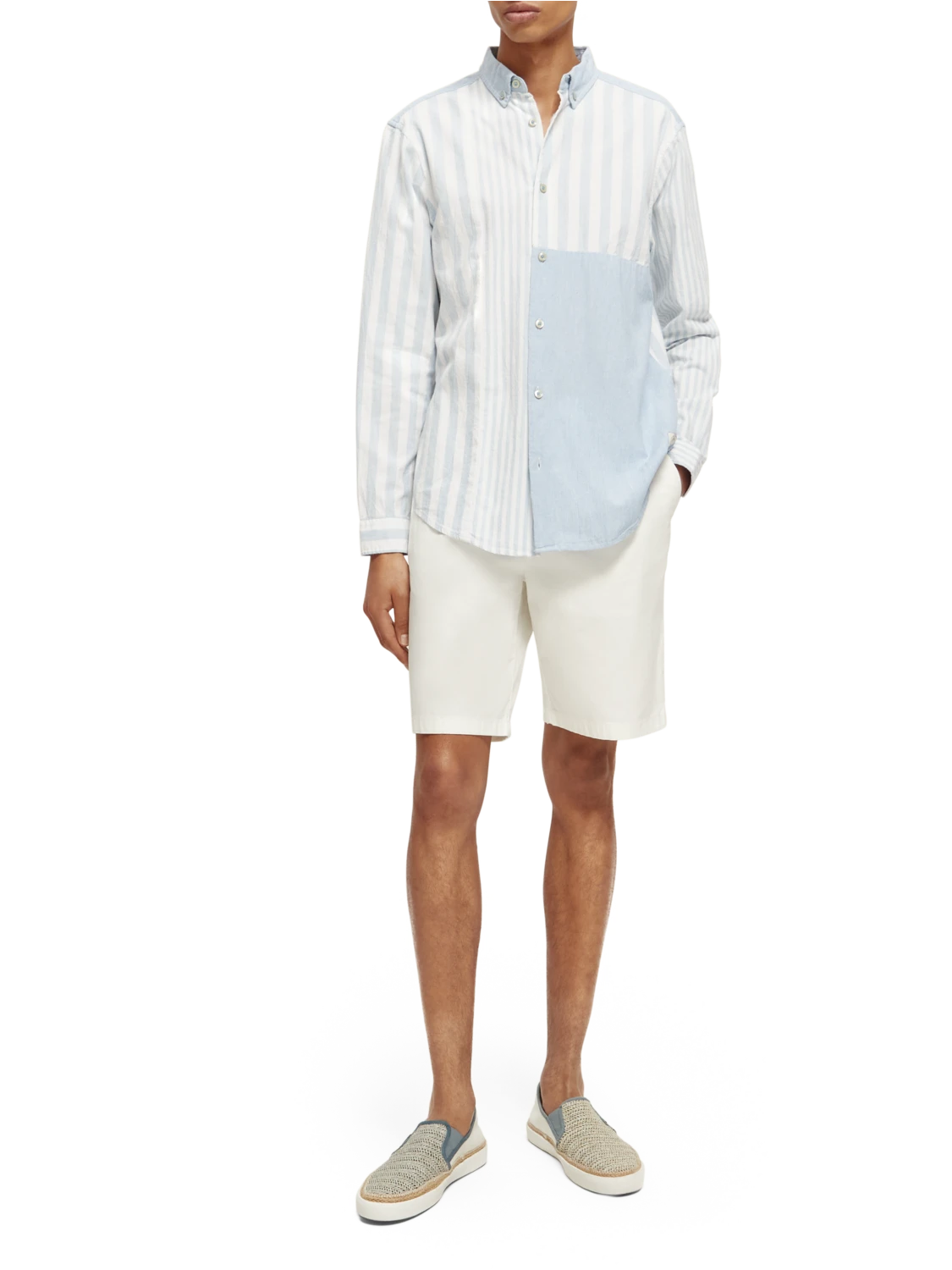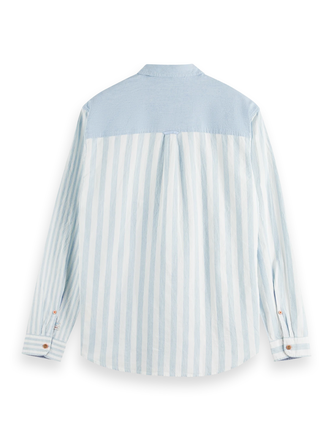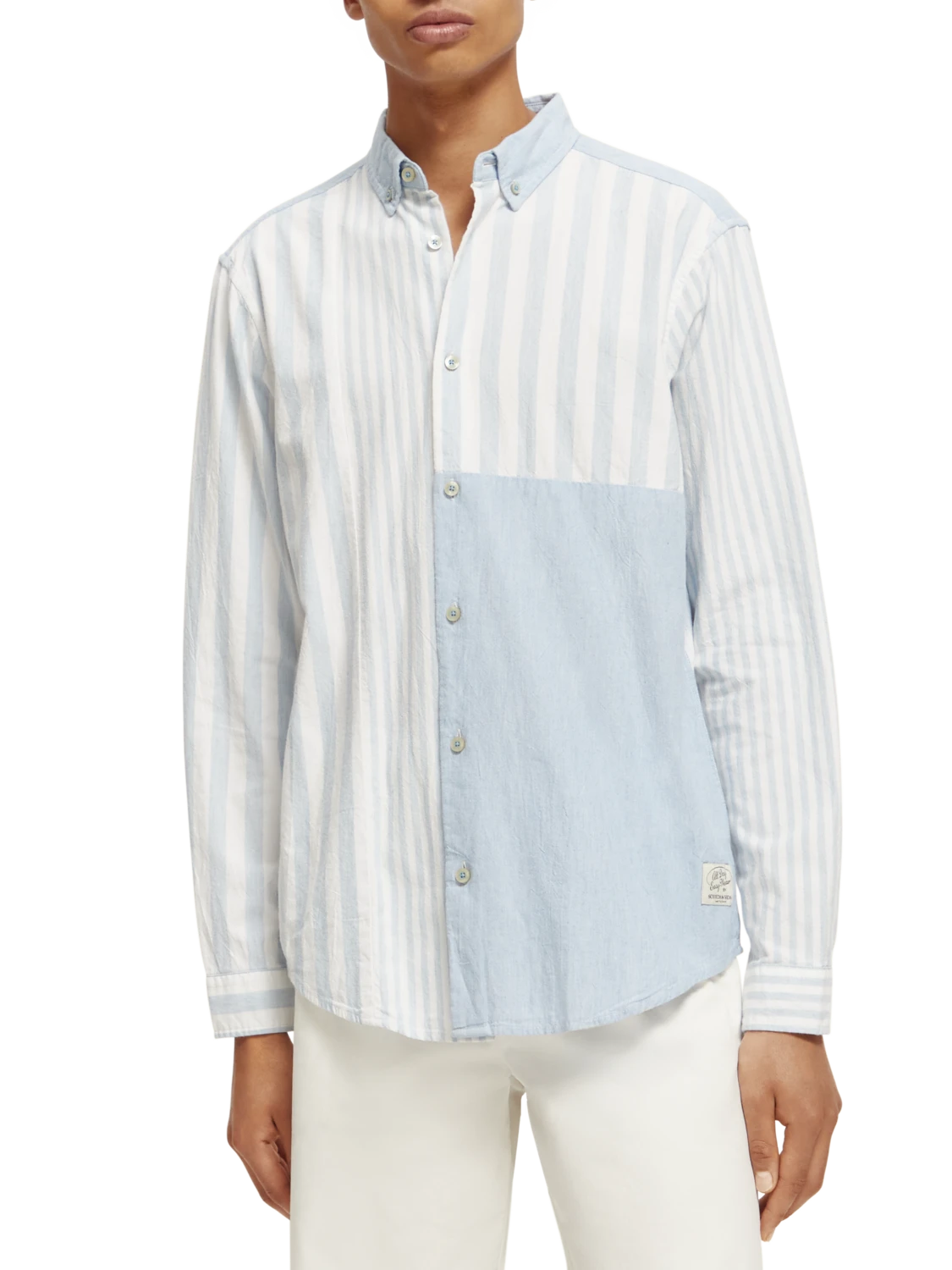 This classic chambray shirt comes with a fun mixed & match striped motif. Finished with a classic collar and full-length button closure, this shirt is a versatile style, ready to be worn for any occasion.