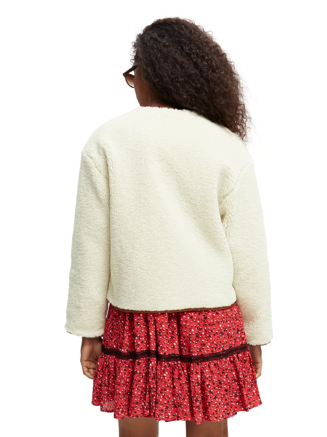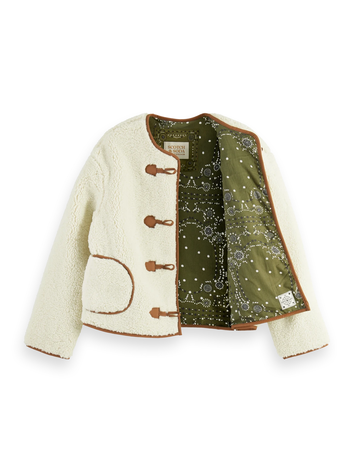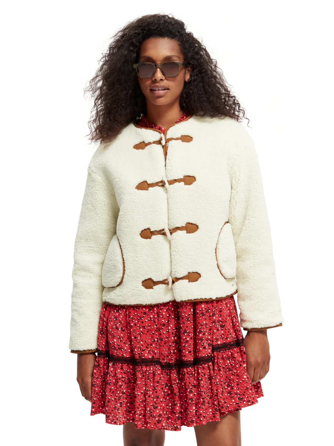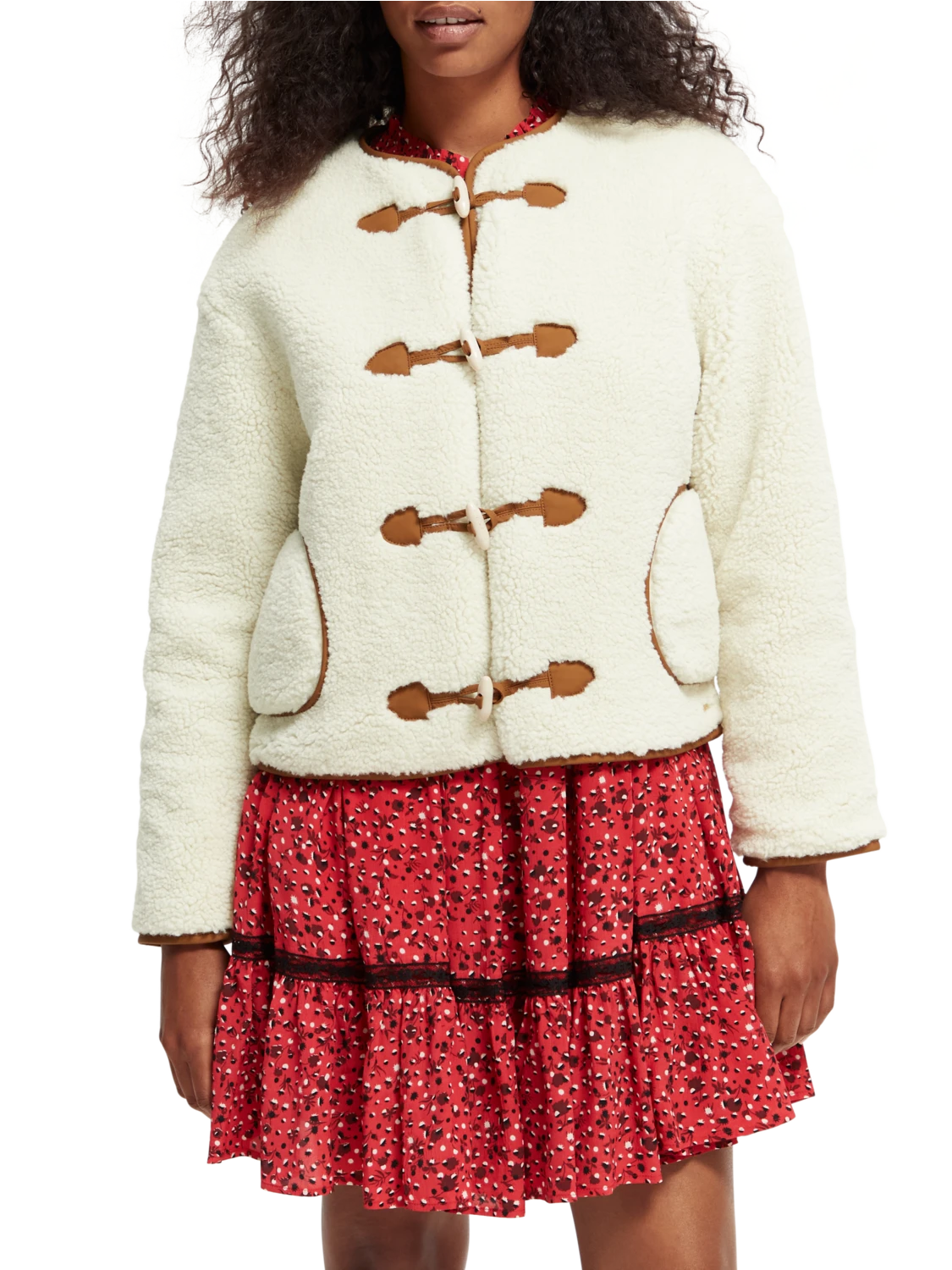 All-over printed teddy fabric, complete with soft trimmings. Finished with a button closure and leathet trimmings, this jacket a perfect addition to any collection.