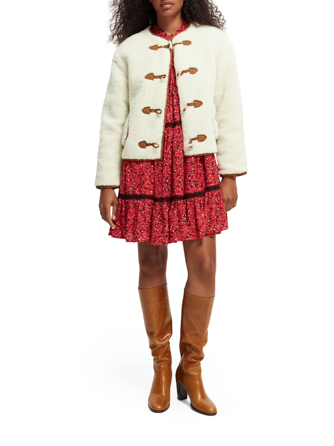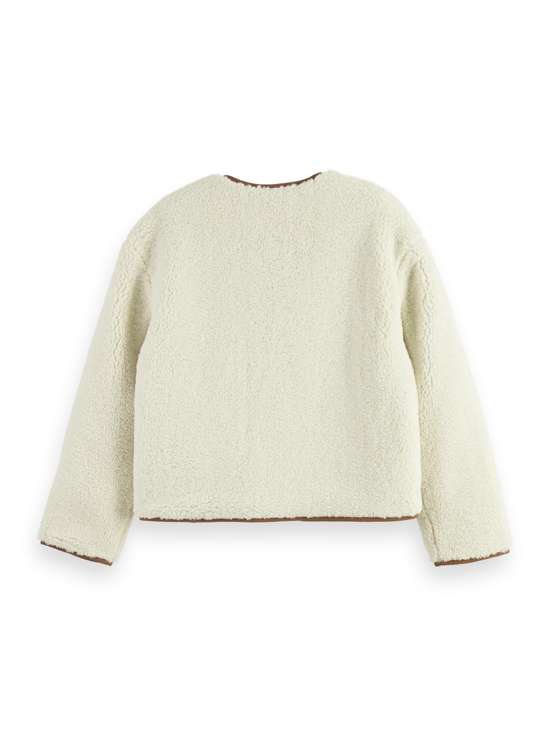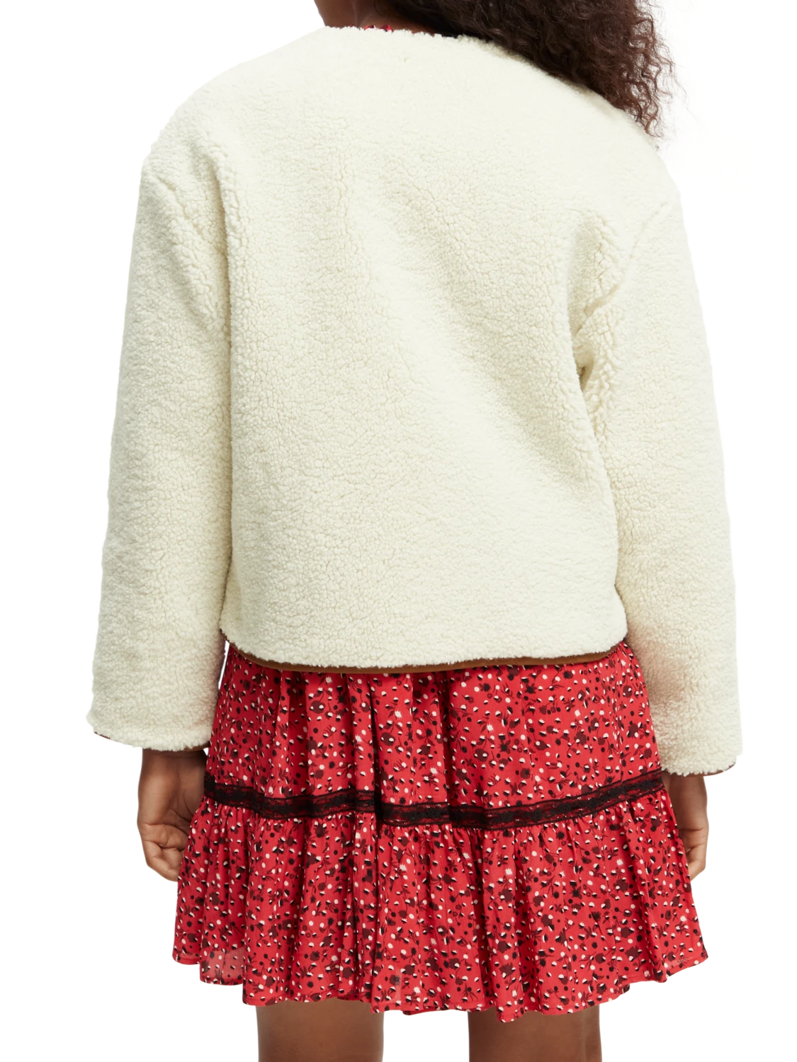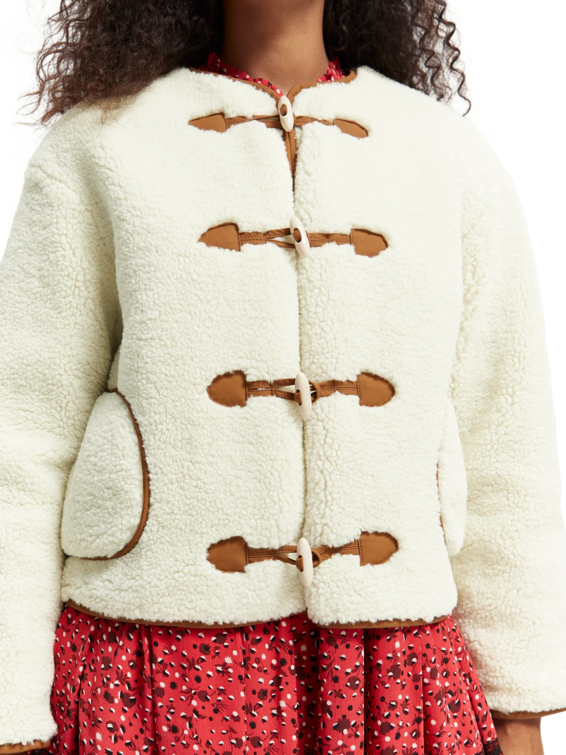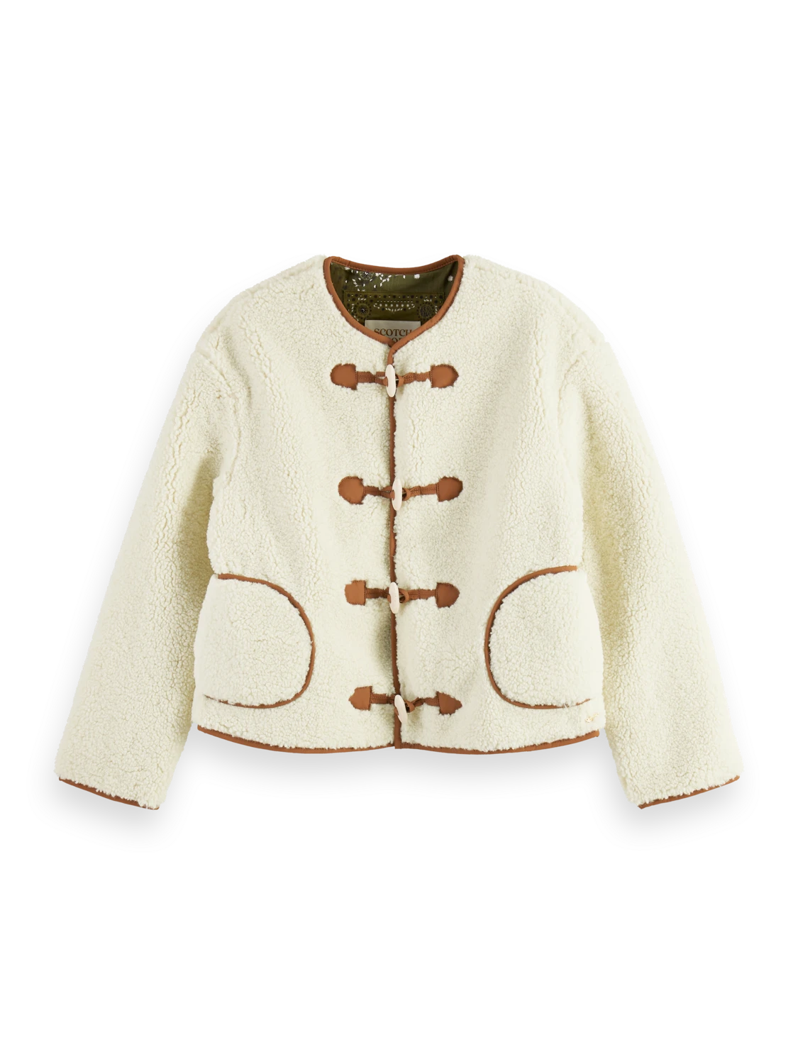 All-over printed teddy fabric, complete with soft trimmings. Finished with a button closure and leathet trimmings, this jacket a perfect addition to any collection.