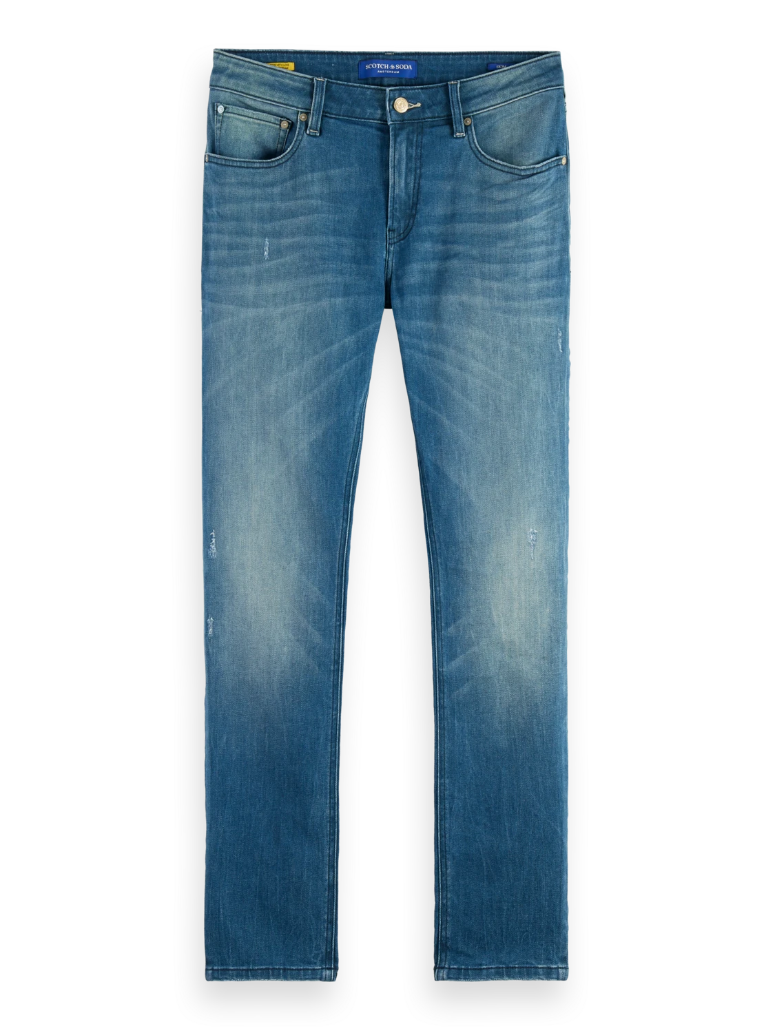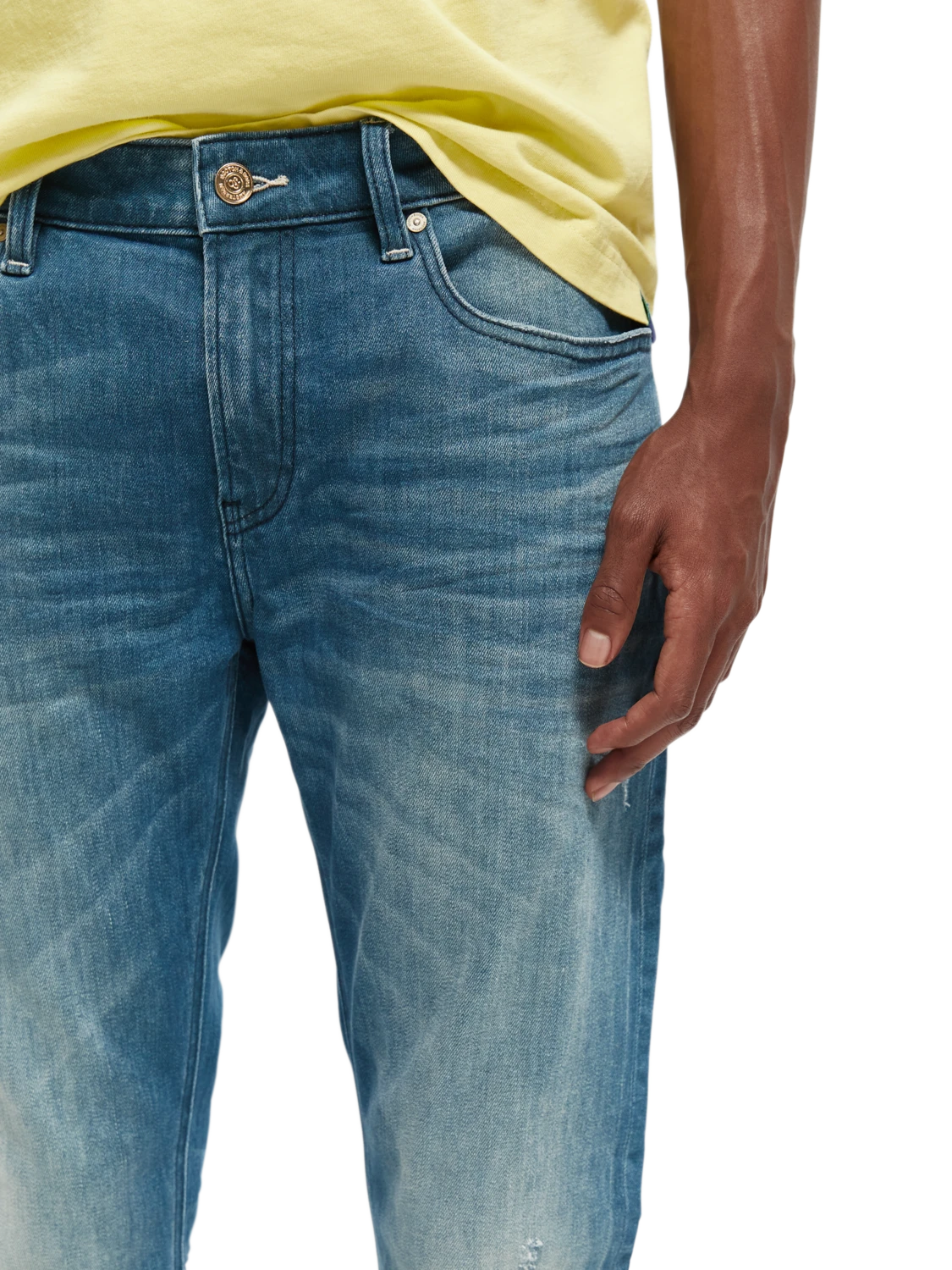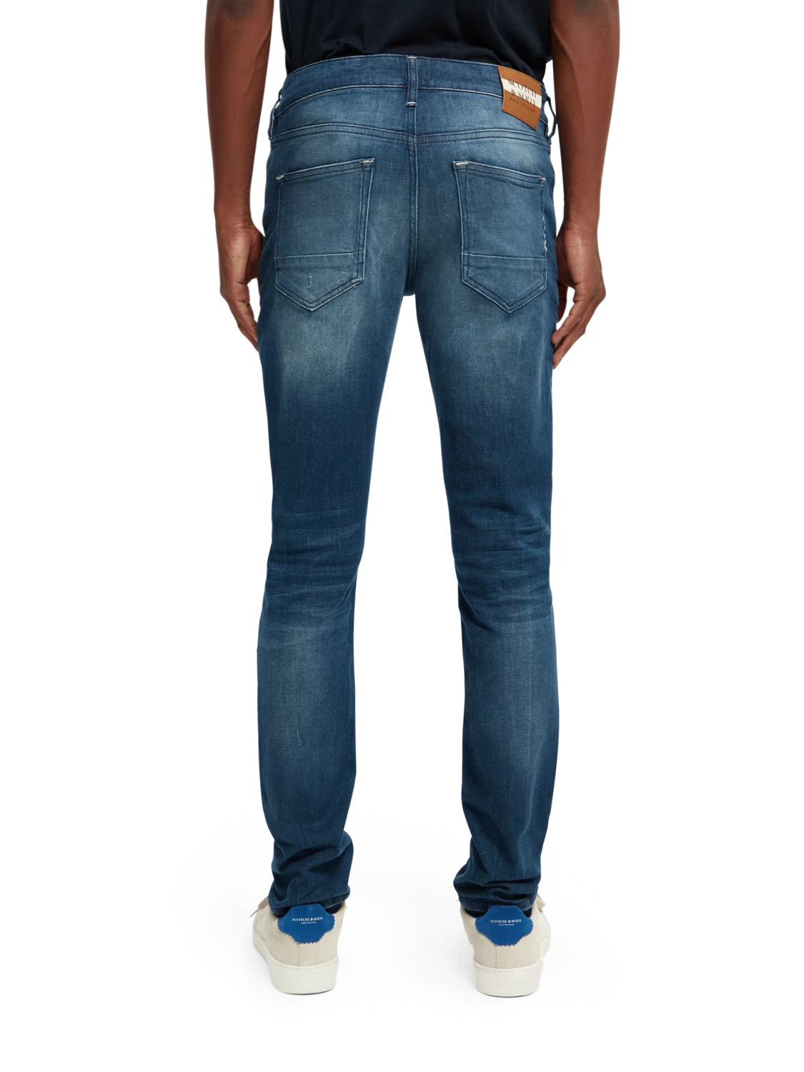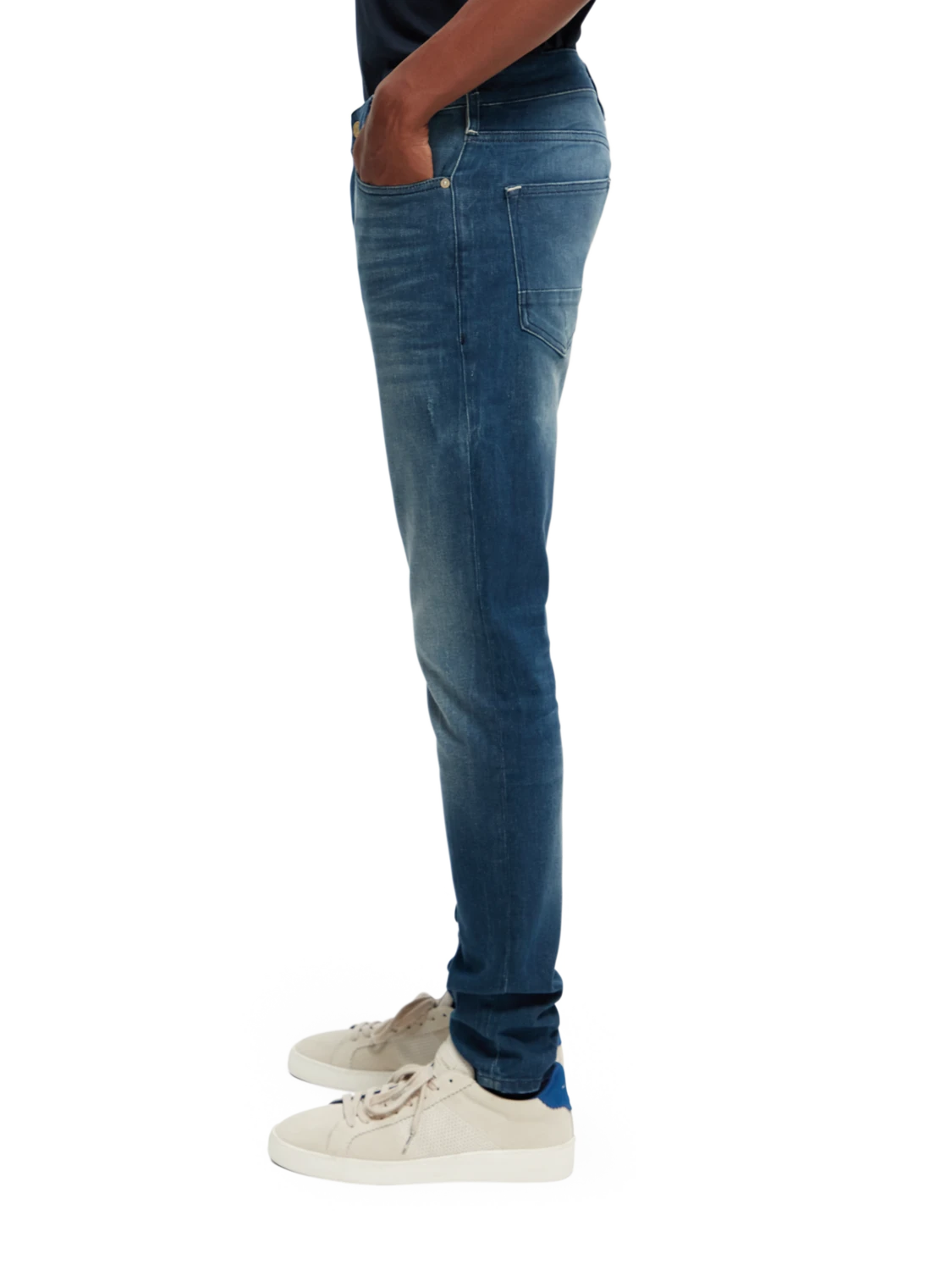 Cut super-slim, the Skim is form-fitting from waist to ankle. An infusion of elastane makes this skinny style comfortable throughout the day. Washed in a mid-blue tone with fading, finished with special coin rivet detailing and a zip fly.