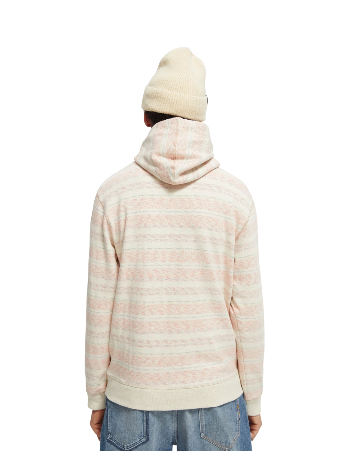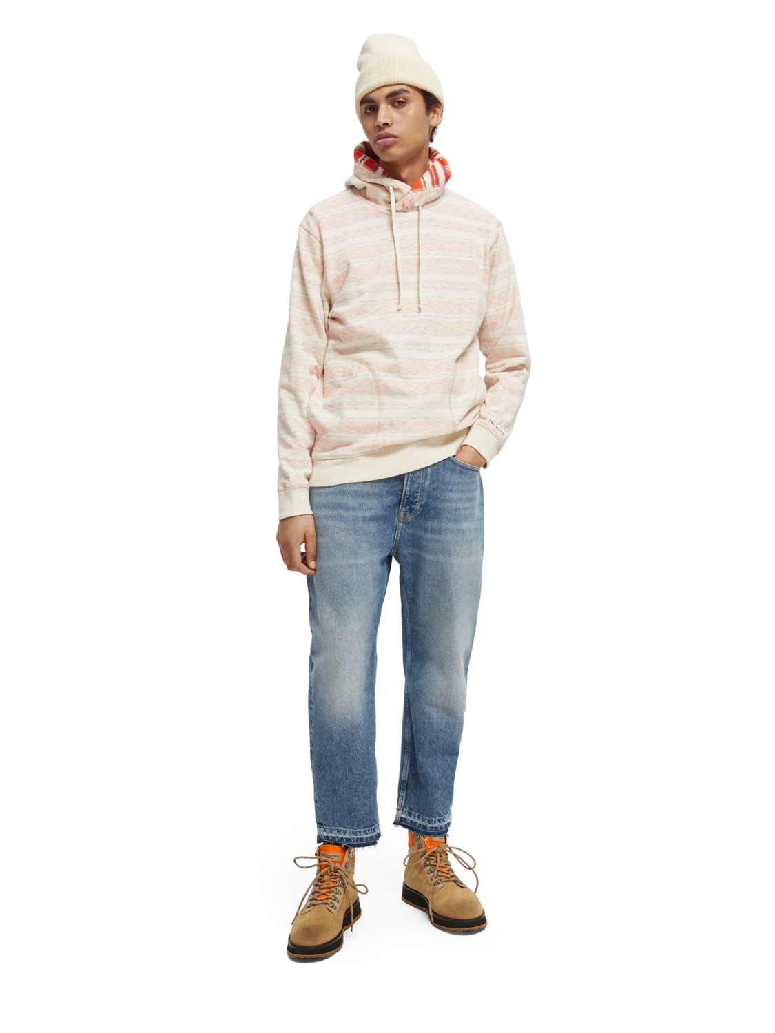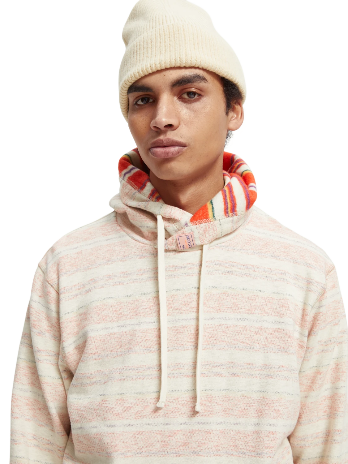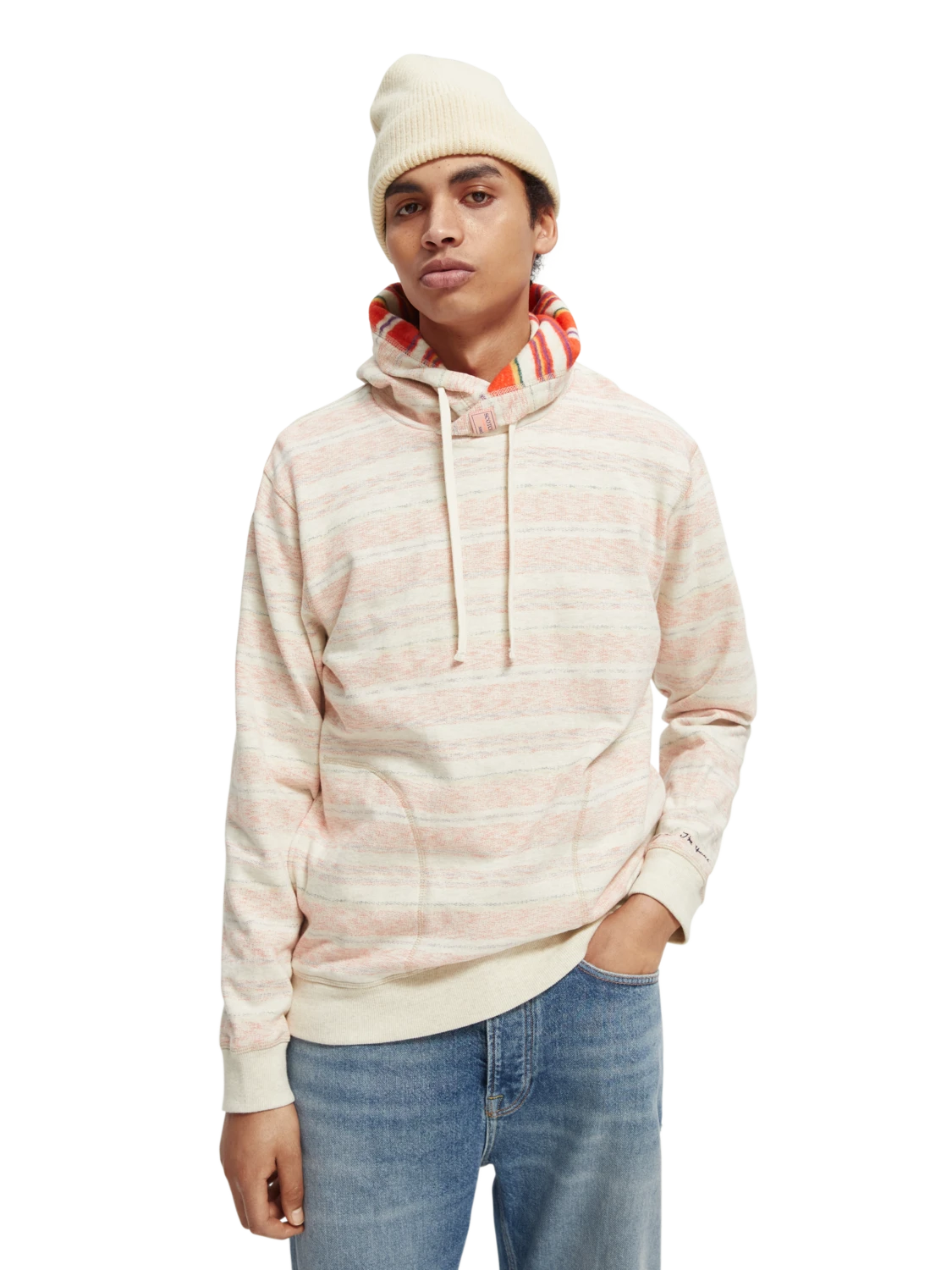 The twisted-hood and striped pattern detail makes this brushed felpa hoodie stand out from the rest. Featuring a Scotch & Soda logo on the hood and an embroidered message just above the left cuff. This comfortable hoodie is made from 100% cotton and is outfitted with side pockets and a hood drawstring for easy adjustments.