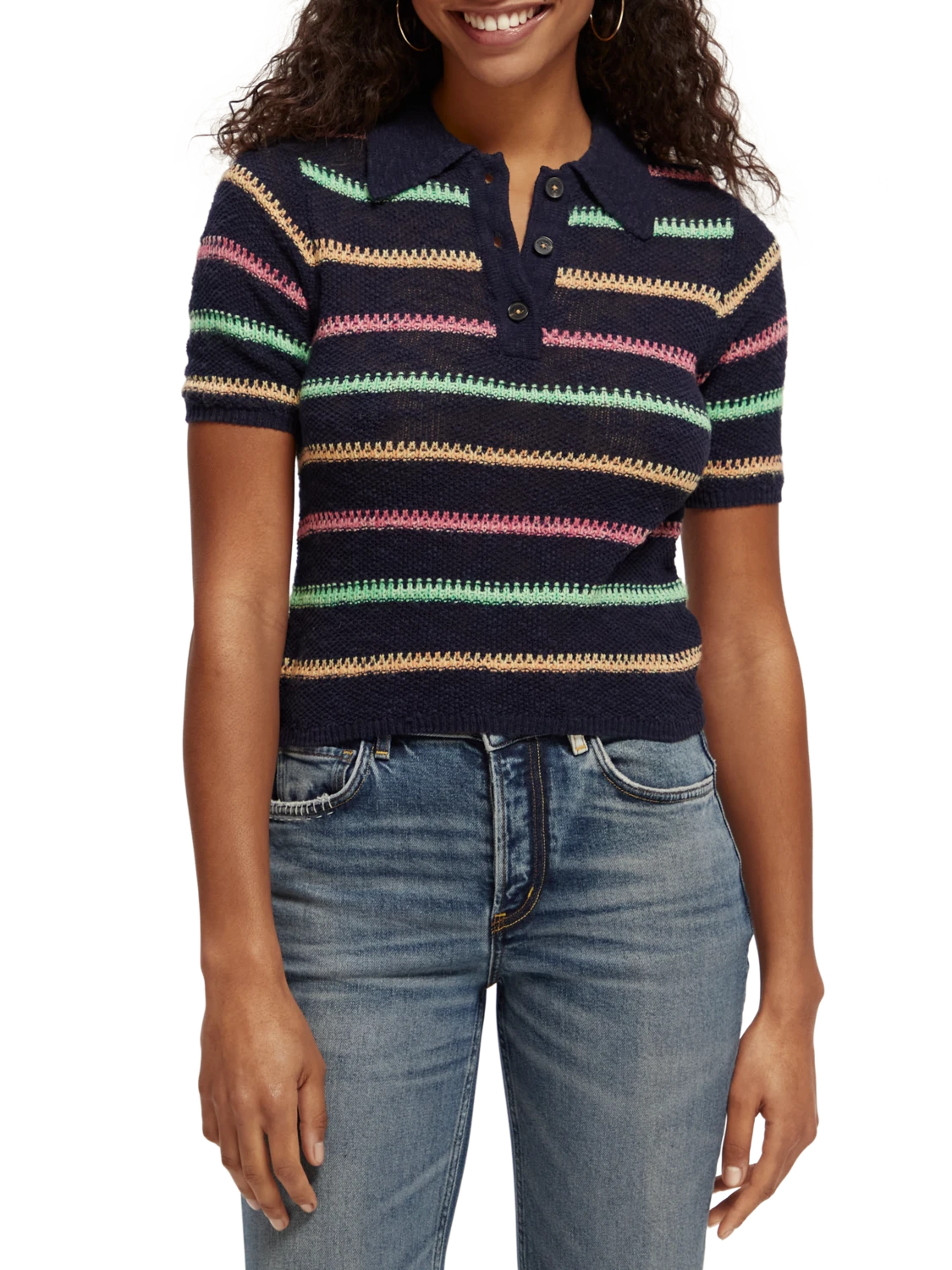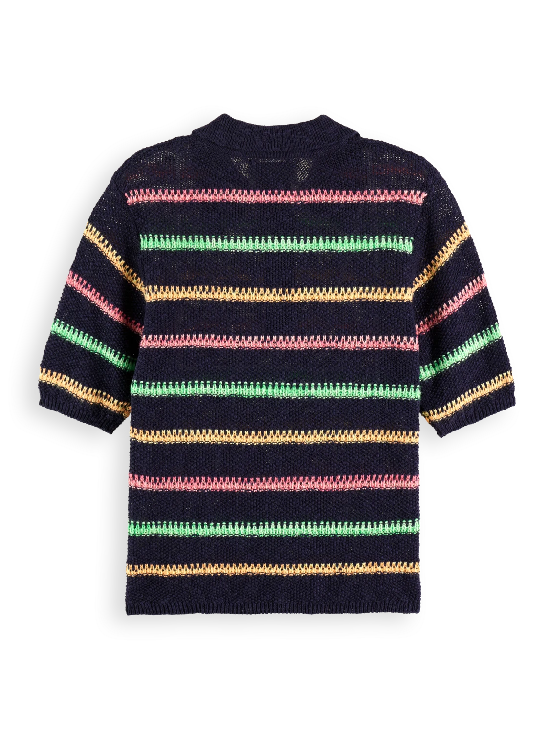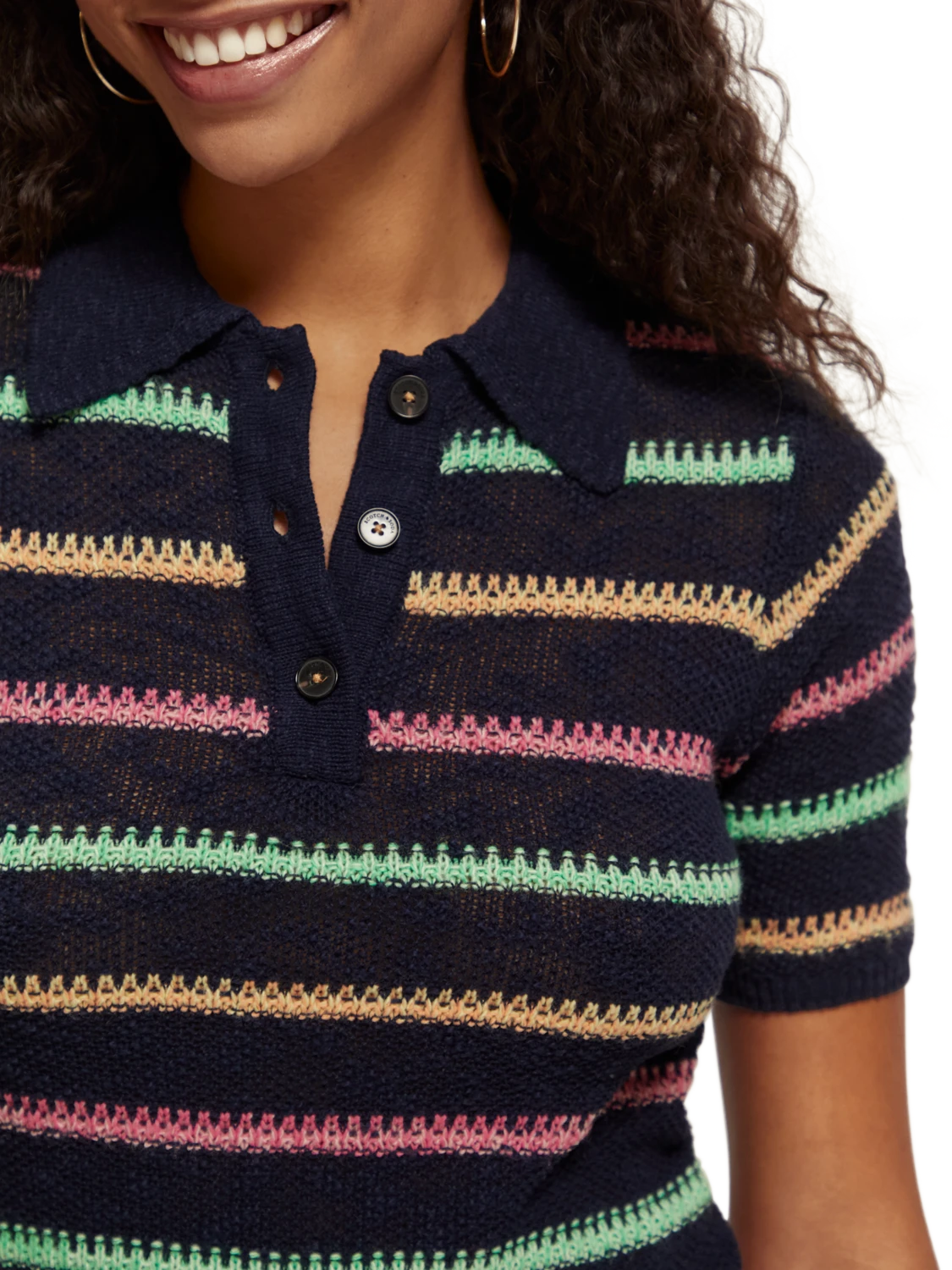 This short-sleeved sweater is made in a polo-style, featuring a classic collar with a multi-coloured playful stripe motif. Finished with a three-button placket, this style is ready for anytime wear.