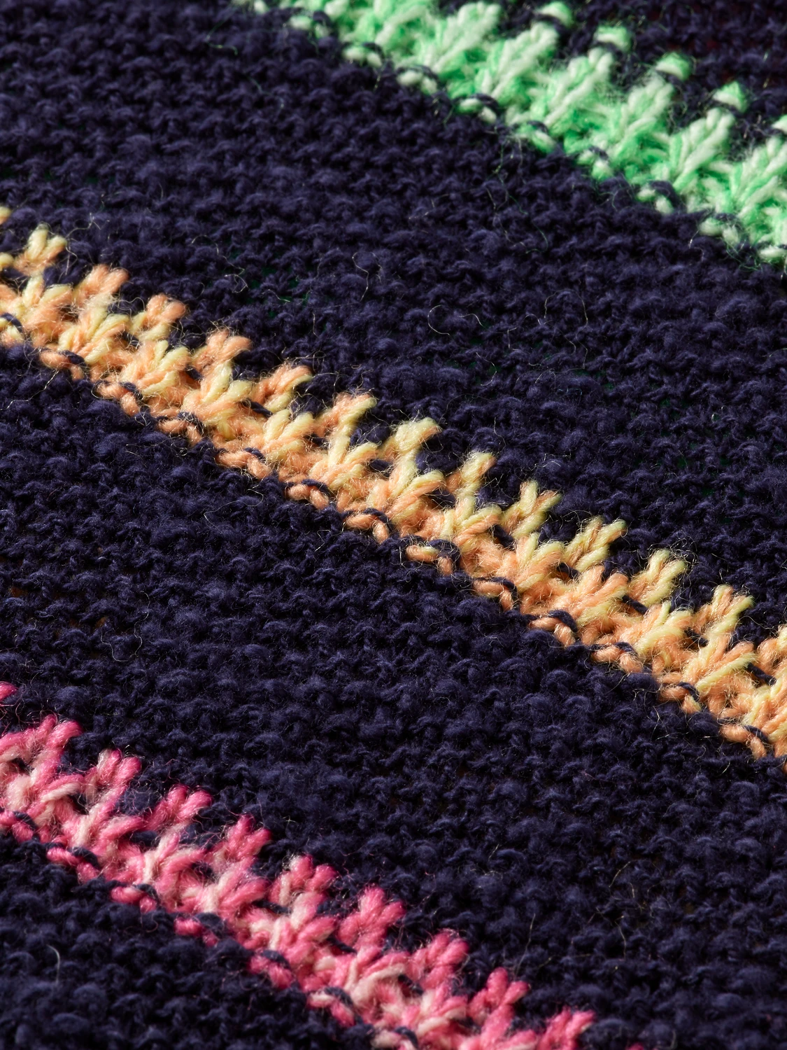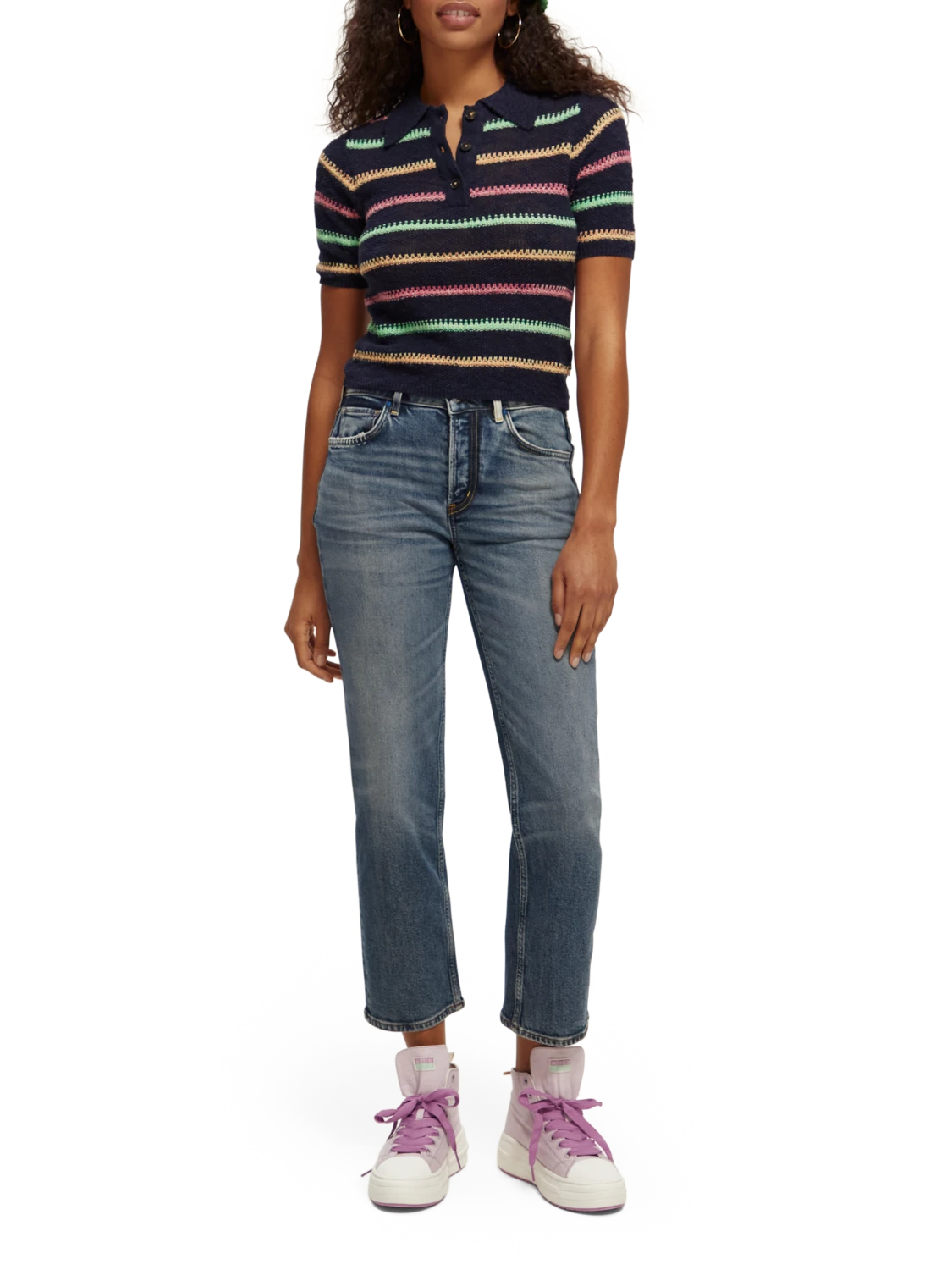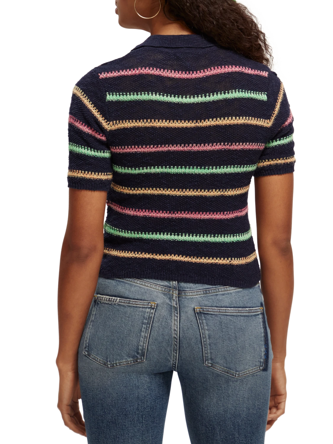 This short-sleeved sweater is made in a polo-style, featuring a classic collar with a multi-coloured playful stripe motif. Finished with a three-button placket, this style is ready for anytime wear.