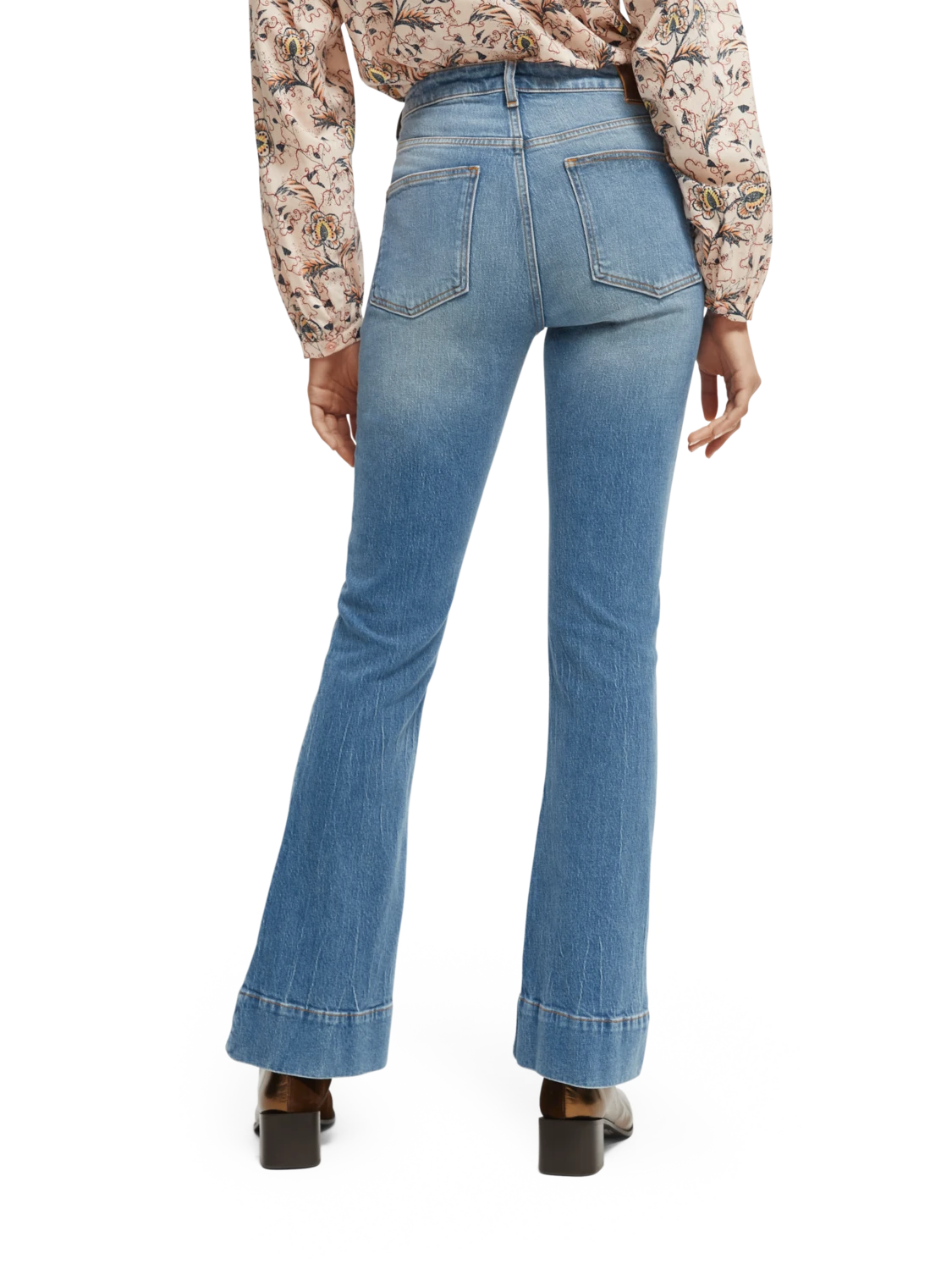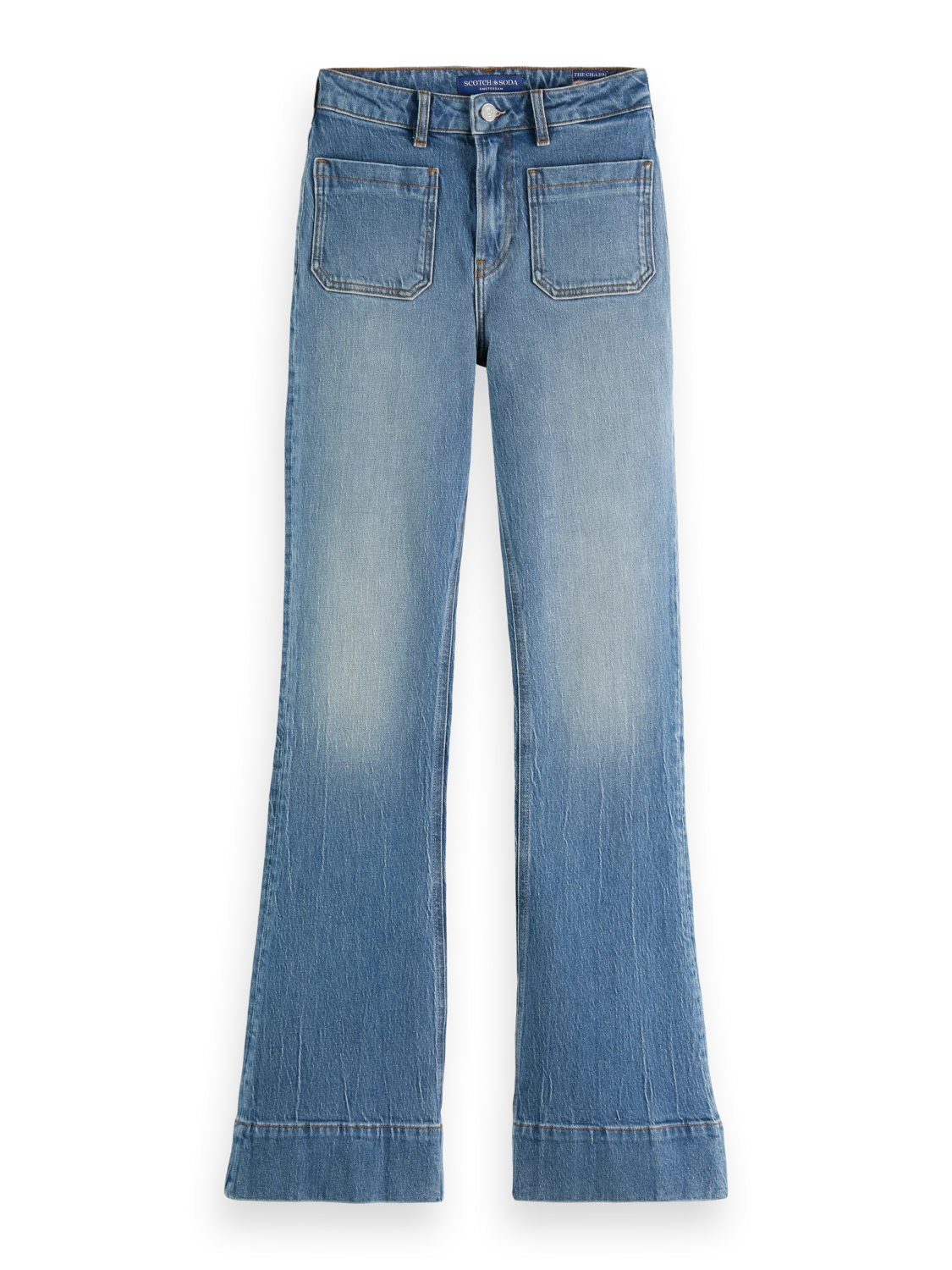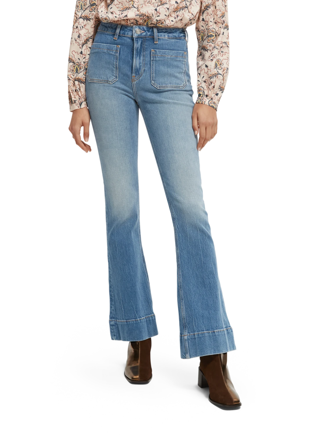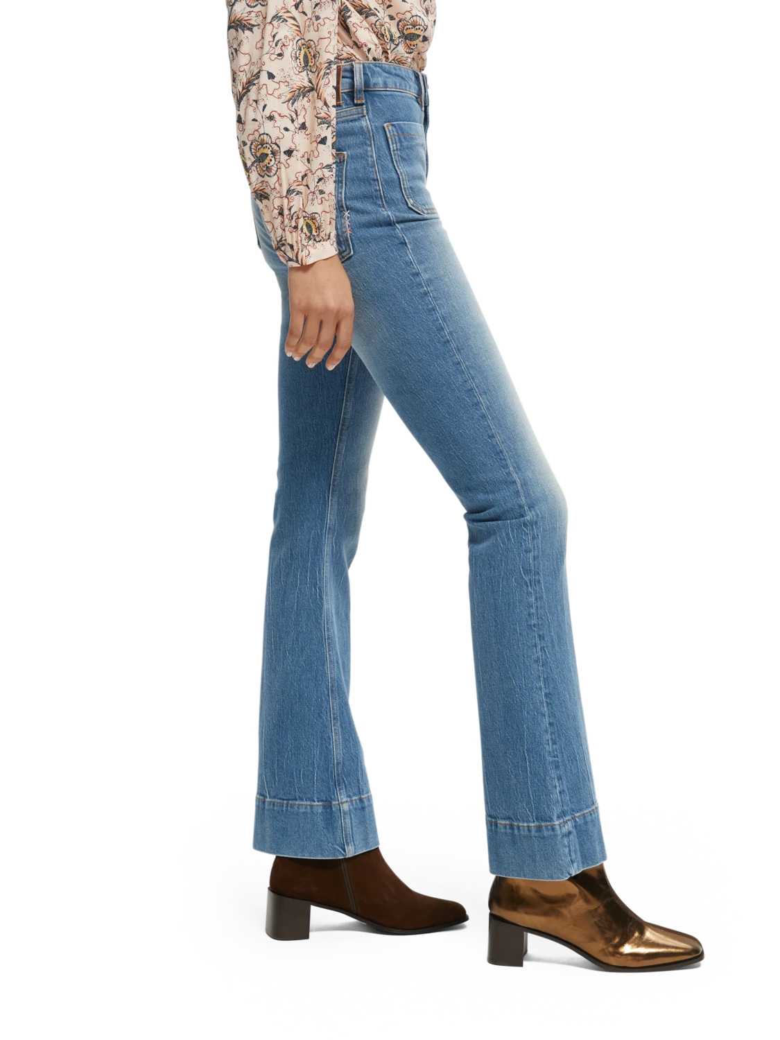 The Charm is our classic flare that comfortably sits high on the waist. The stretch denim is slim at the hips before kicking out at the calf, elongating the leg. Washed in a light blue tone, this style is finished with front patch pockets, a full-length inseam, and zip fly.