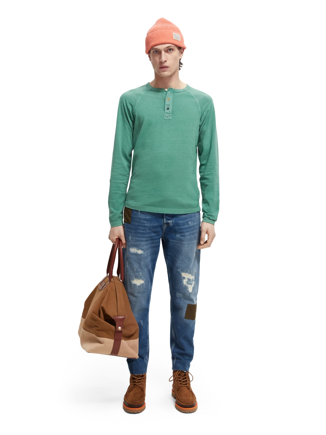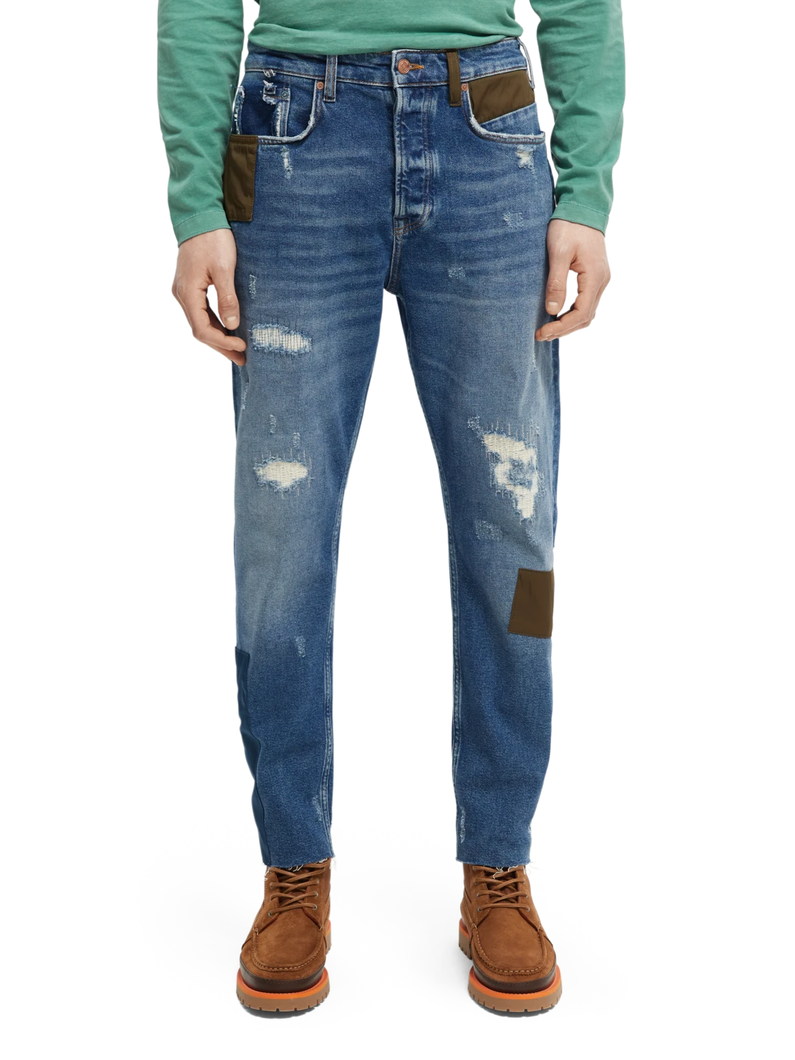 The Dean is our loose tapered-fit jean – with a wide-leg from hip to thigh that transitions into a more tailored ankle. Washed in a mid-blue tone with patchwork and distressed detailing, this relaxed style is finished with large back pockets and a button fly.