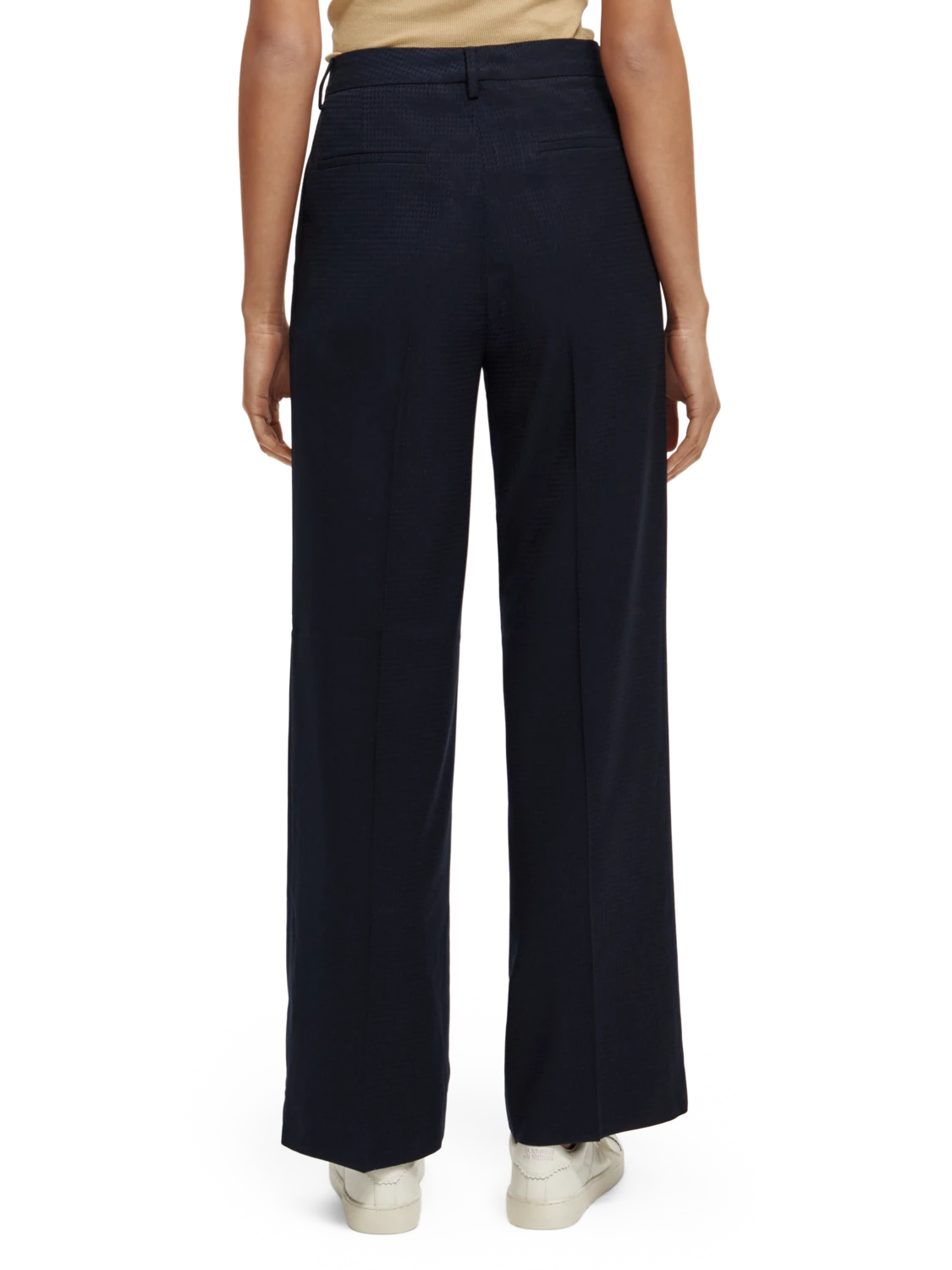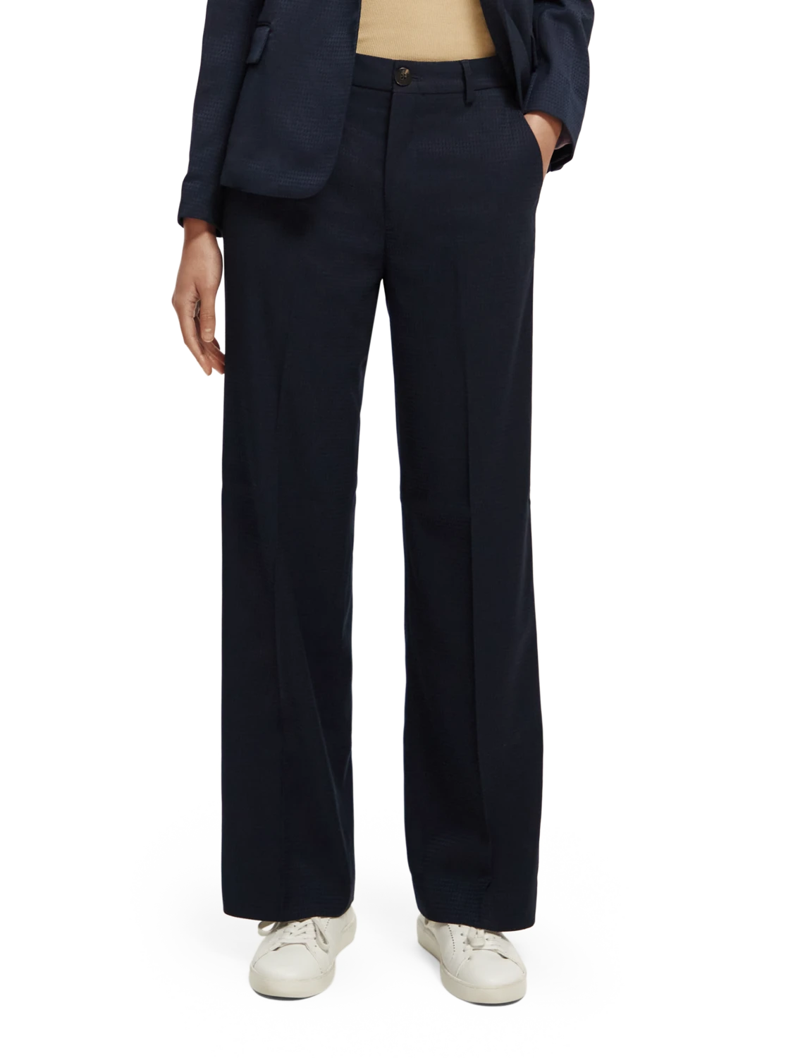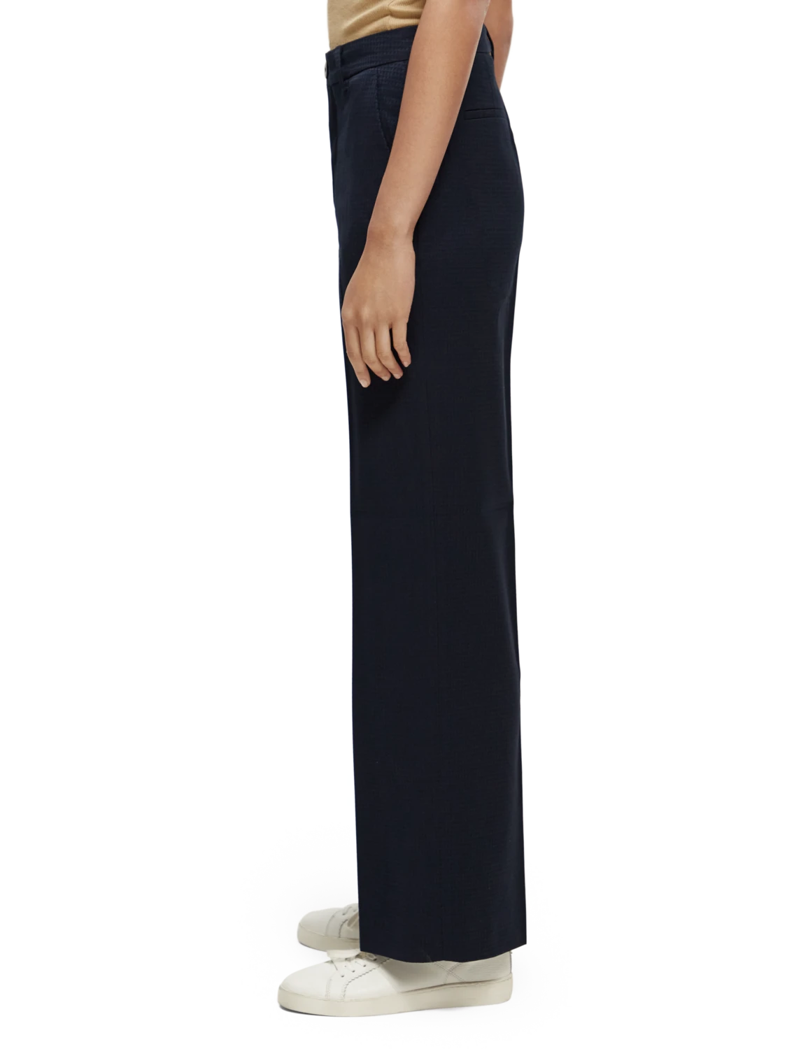 The Edie is our high-rise trousers with a wide-leg, giving a comfortable, streamlined look from waist to floor. Made from a lightweight material with a tough of elastane, this style is finished with belt-loops and a zip fly.