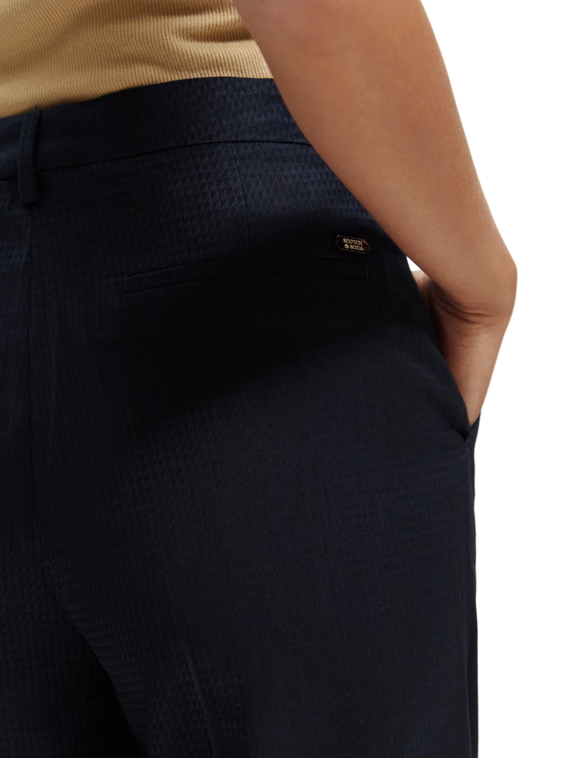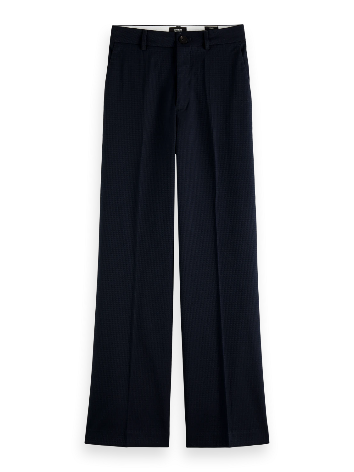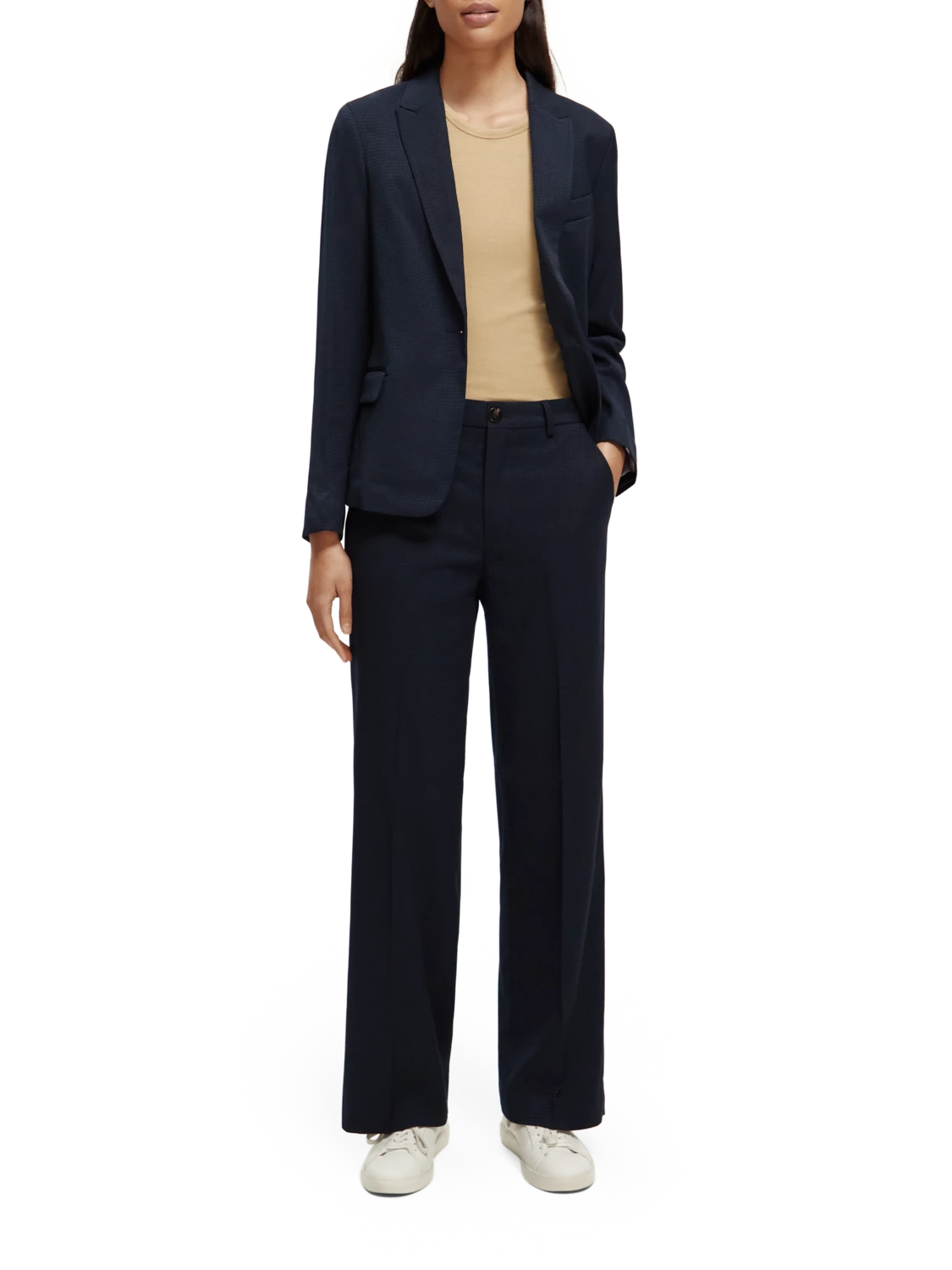 The Edie is our high-rise trousers with a wide-leg, giving a comfortable, streamlined look from waist to floor. Made from a lightweight material with a tough of elastane, this style is finished with belt-loops and a zip fly.