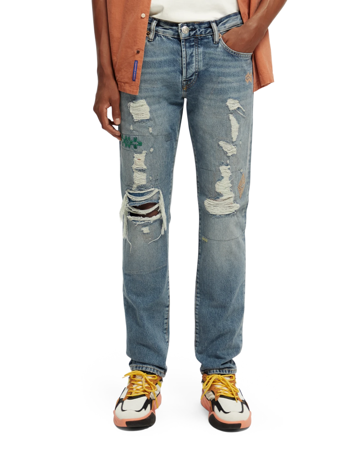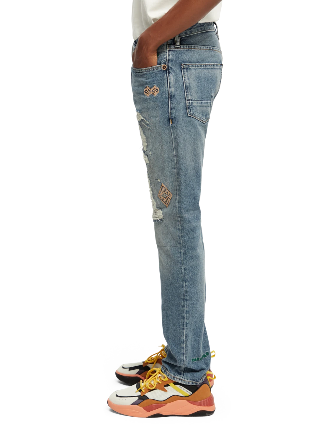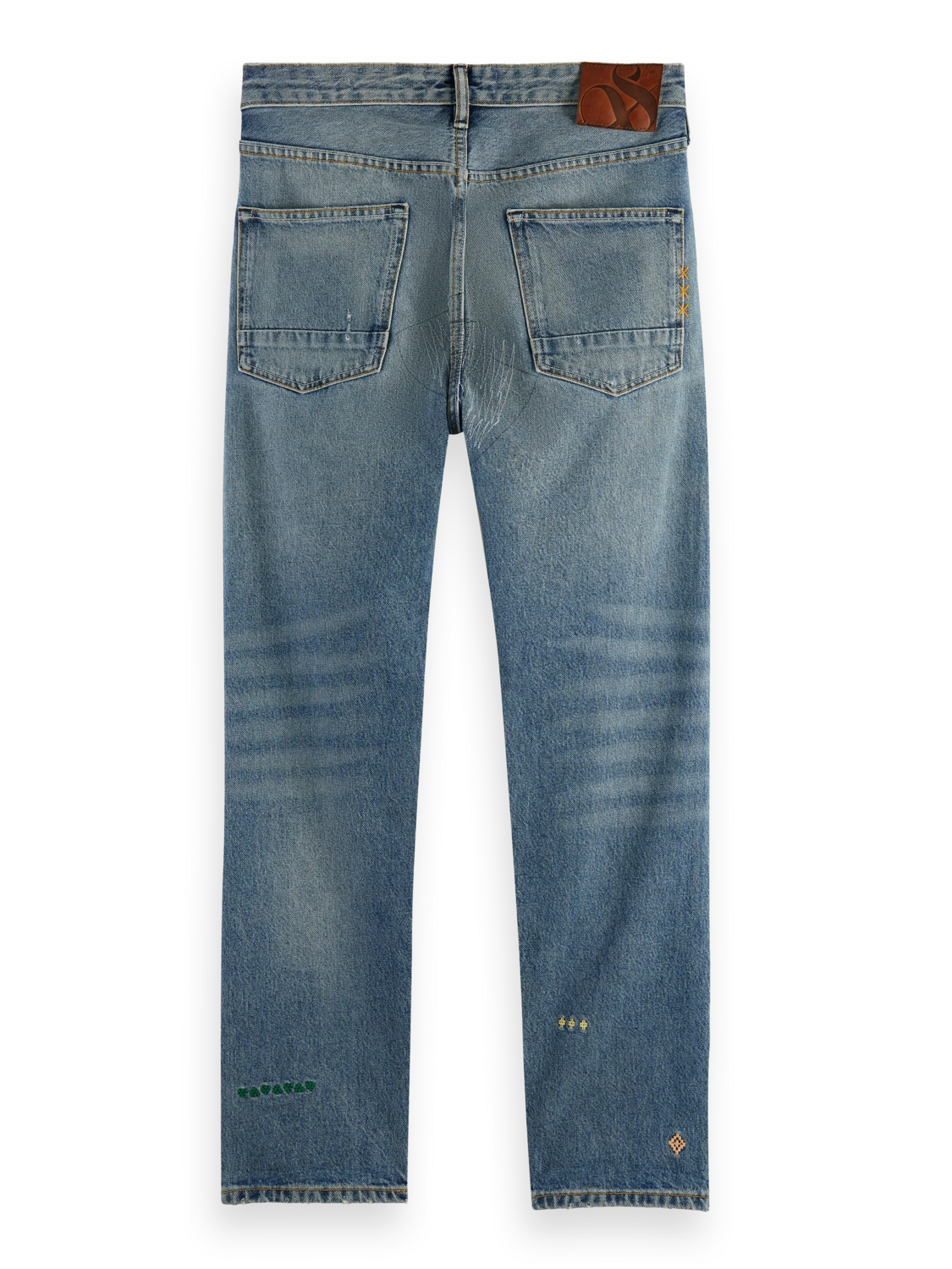 The Ralston is an iconic long-standing favourite. Cut for a regular slim fit – a hint of elastane gives a comfortable, relaxed feel. Our latest take has distressed features and ikat patterning and is washed in a mid-blue tone – complemented by the button fly and stylistic detail at the coin rivet.