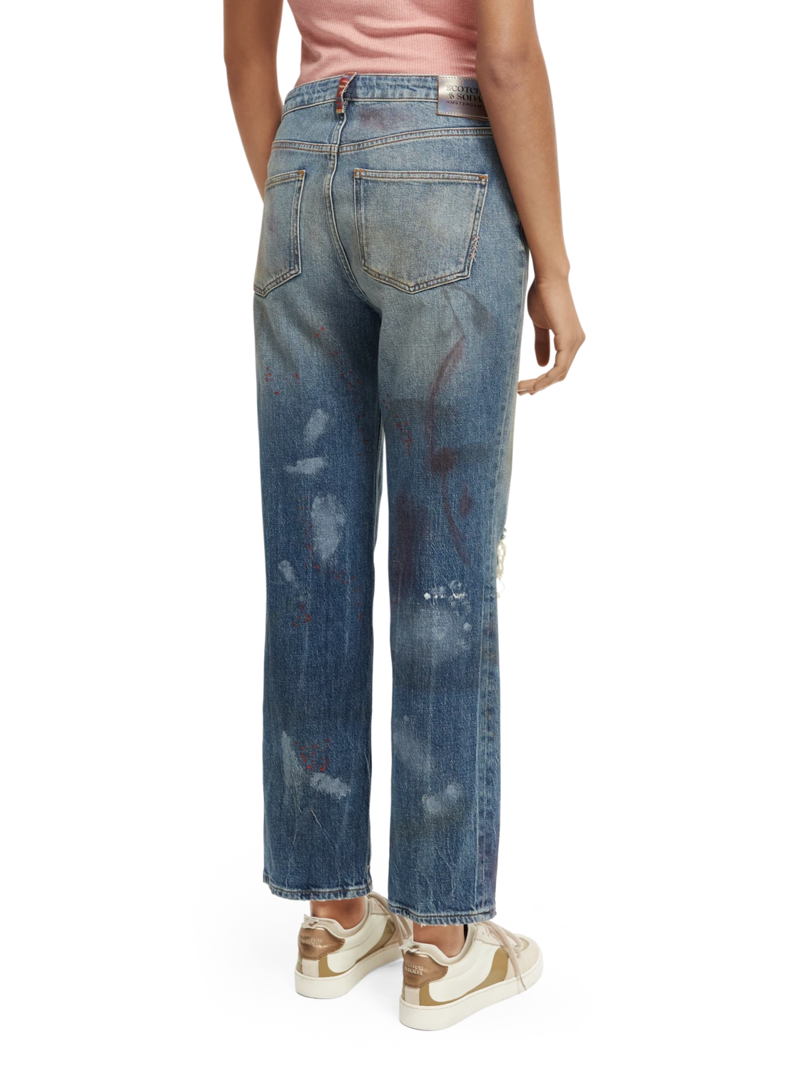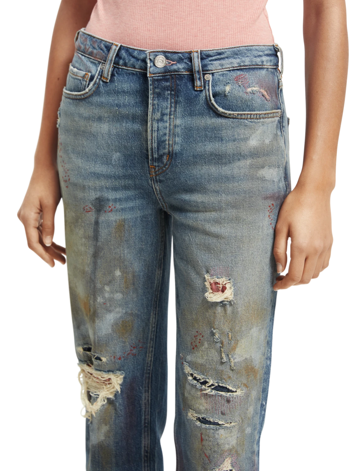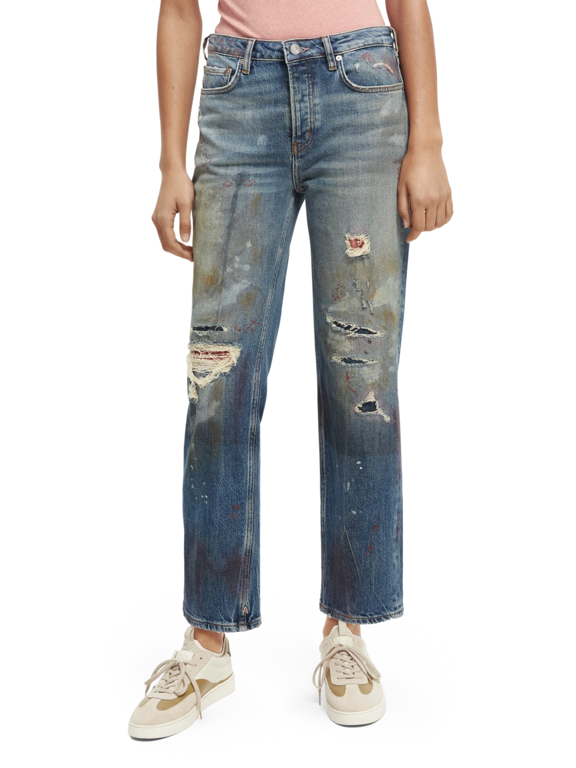 The Sky has a straight leg fit that sits high on the waist and ends just above the ankle. Washed in our Stardust tone with distressed accents and ikat repairs, this style has refined pocket detailing and a button fly.