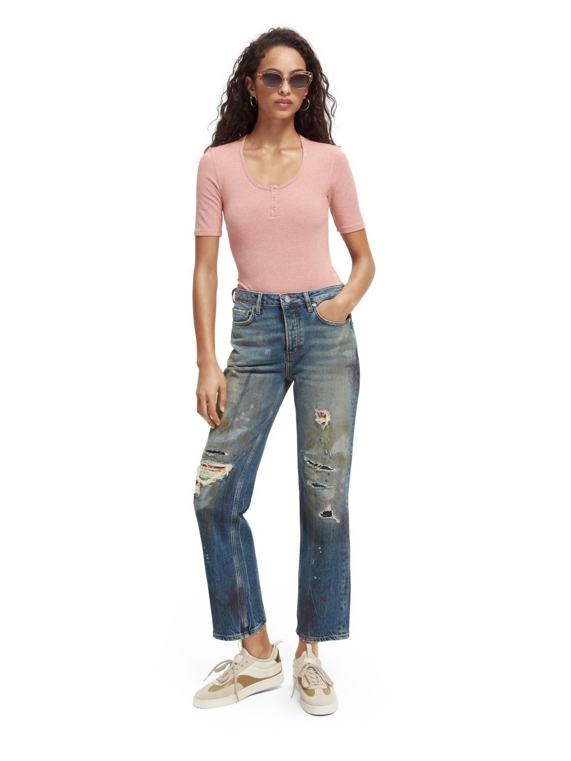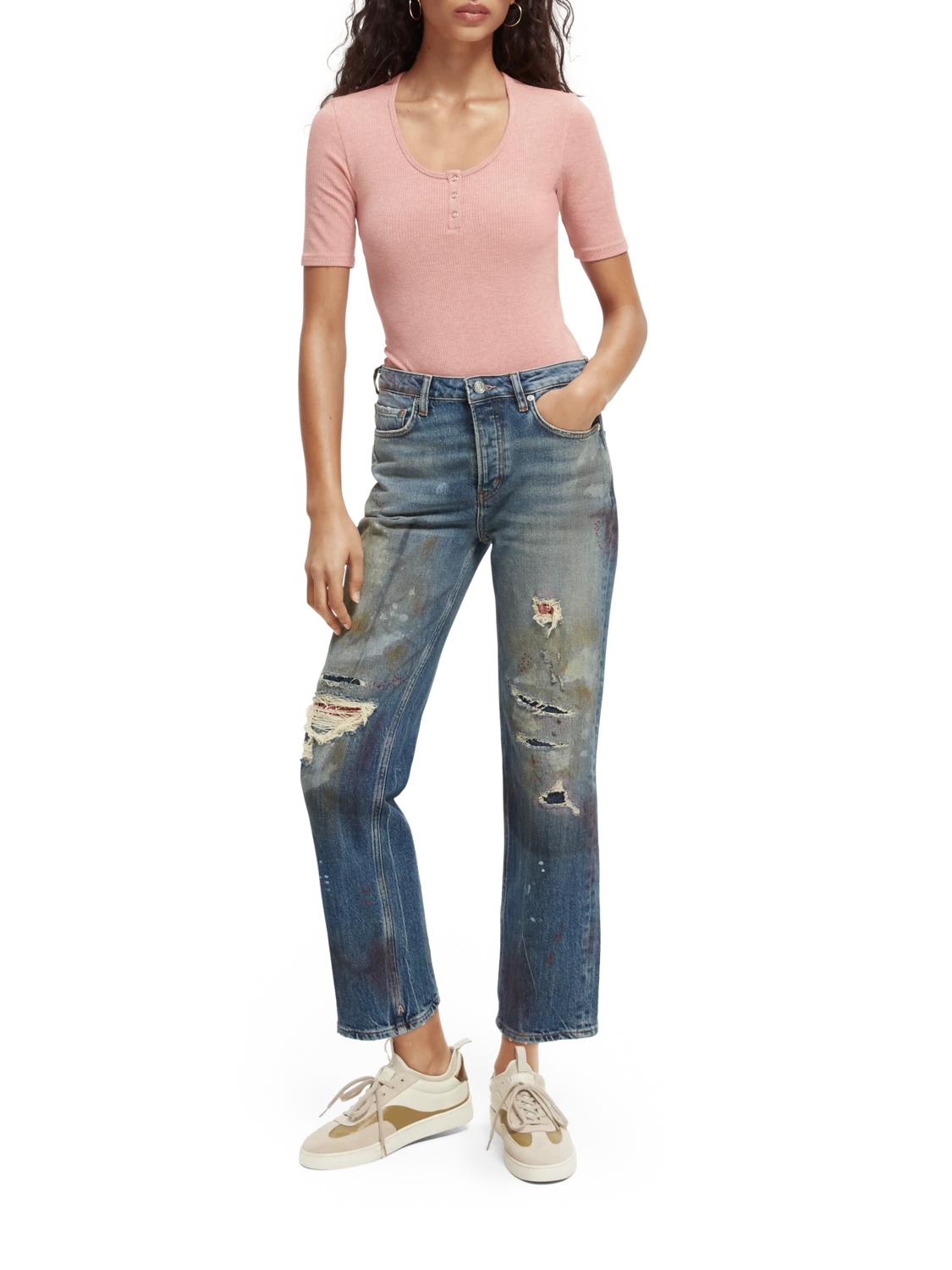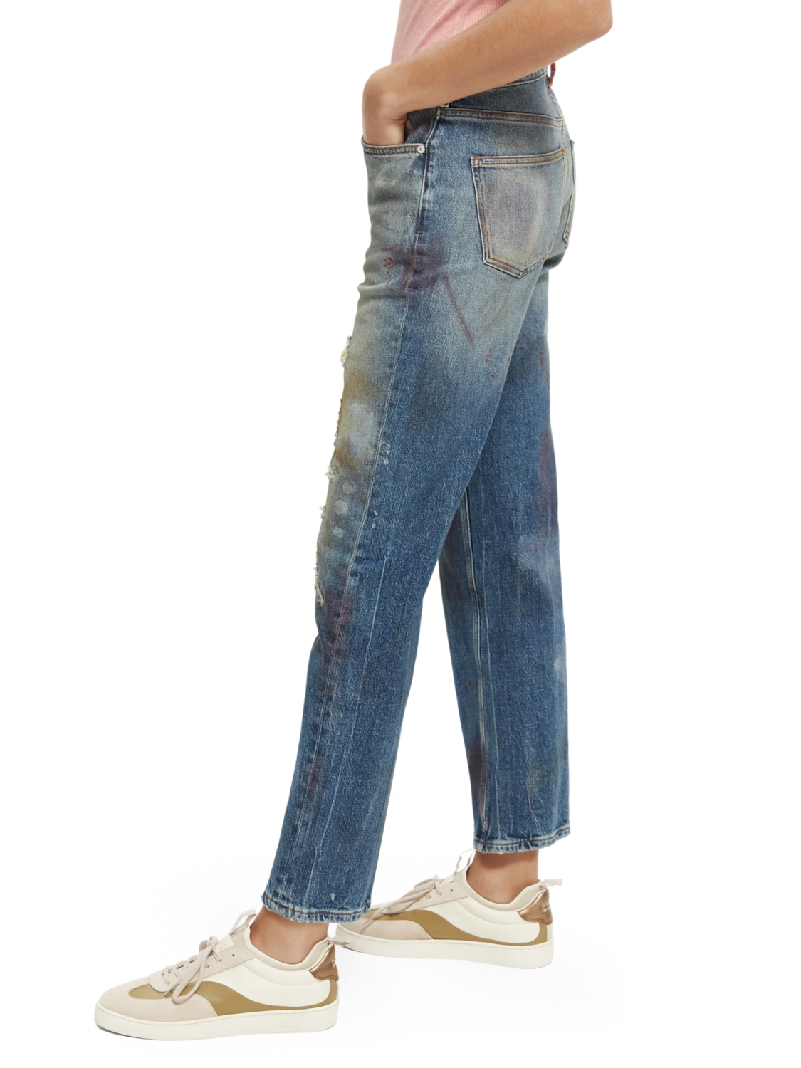 The Sky has a straight leg fit that sits high on the waist and ends just above the ankle. Washed in our Stardust tone with distressed accents and ikat repairs, this style has refined pocket detailing and a button fly.