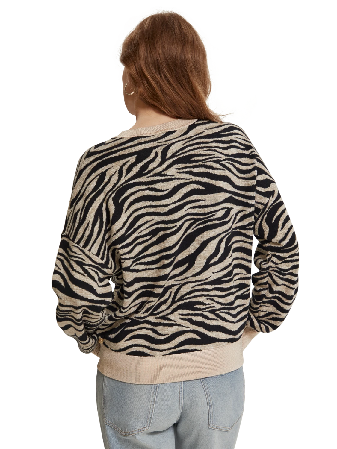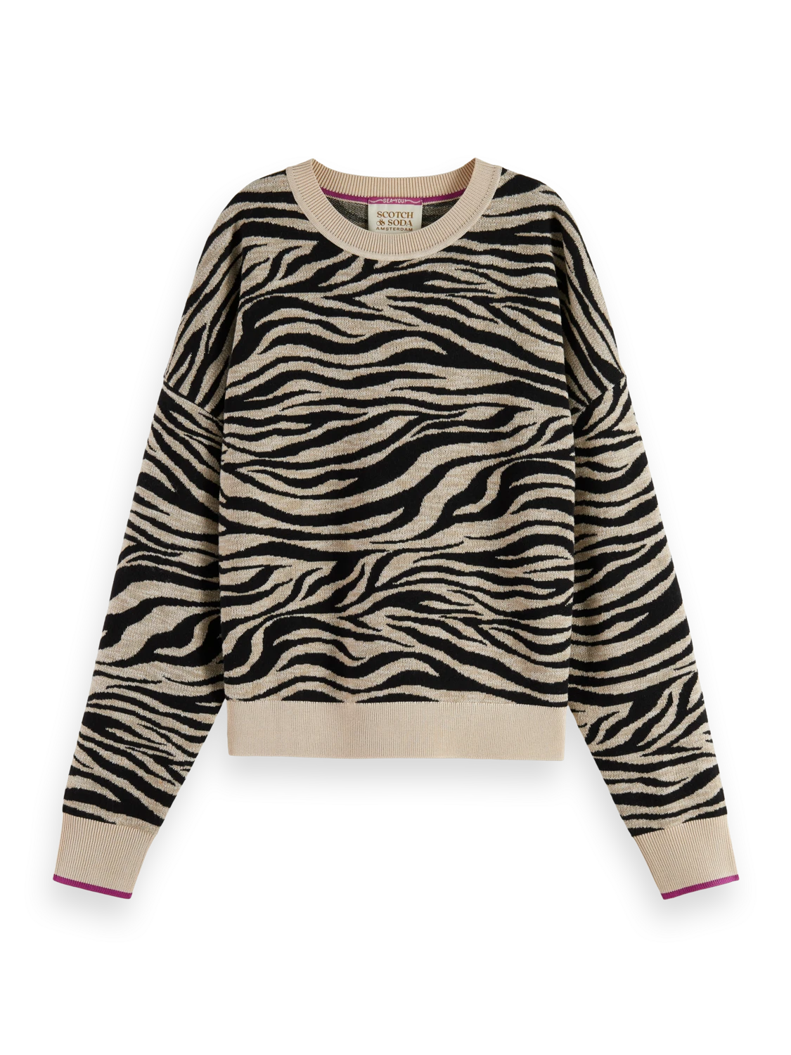 Unleash your bold side with this tiger jacquard crew neck pullover. The striking tiger jacquard pattern adds a fun and playful element to this classic silhouette. Made from a soft and comfortable fabric, this pullover is perfect for making a statement.