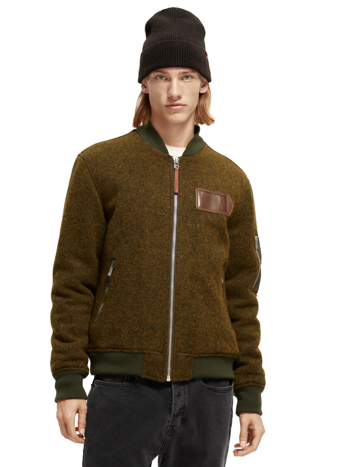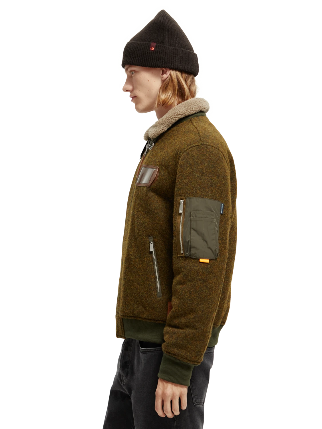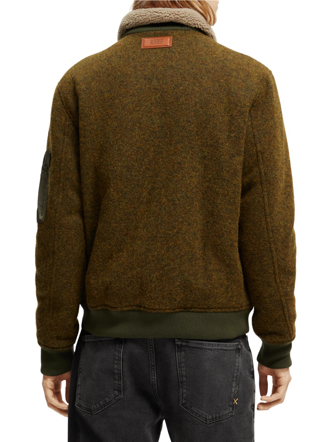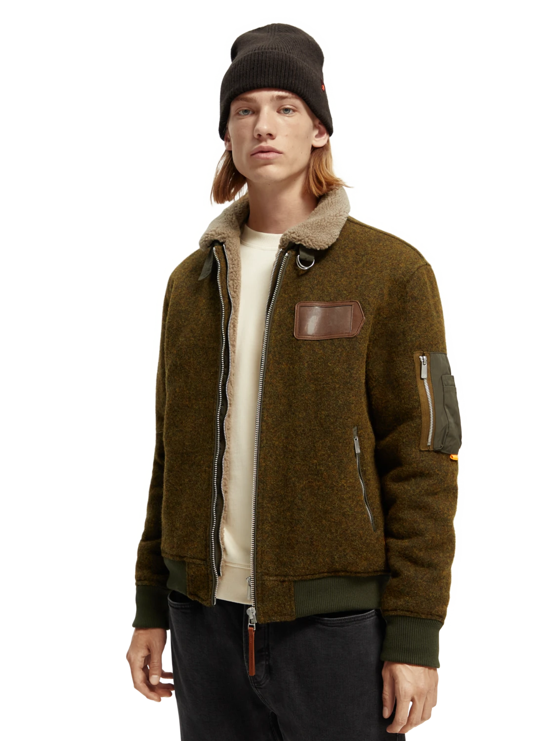 The bomber jacket is a proven style, popular across generations. Made from a wool (70%) blend, teddy color, finished with a ribbed hem and cuff .